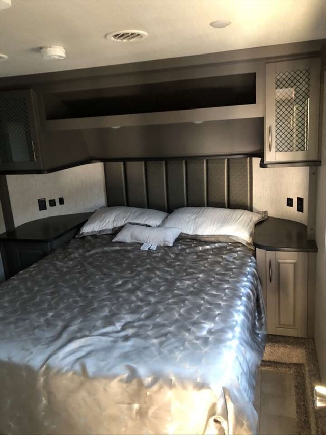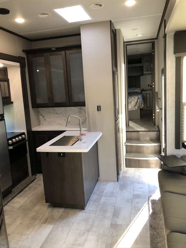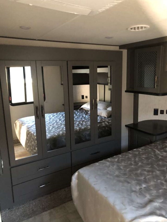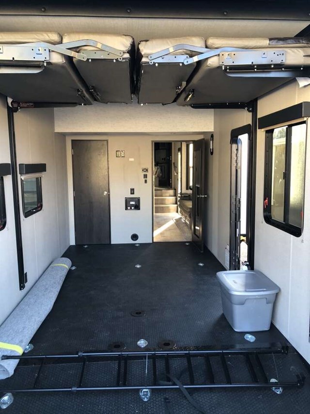 Just imagine the fun you will have with this Momentum G-Class toy hauler set up at any off-road park. With the 14' 6" separate garage that includes a half bath, a second exterior entry door, rollover sofas, a power bunk, and a loft, you will have your own area to do what you like. The rear ramp door can even be converted into a patio if you need more outdoor living space. The main living area offers a fireplace, theater seating, and kitchen appliances away from the dirty garage floor. You will also be able to stay clean and ready for the next ride with the sunken tub/shower in the full bathroom, and the front master bedroom has plenty of storage for clothing with the wardrobe slide and overhead cabinets. You might even choose to add a washer and dryer option to this trailer to keep everything clean while away from home.