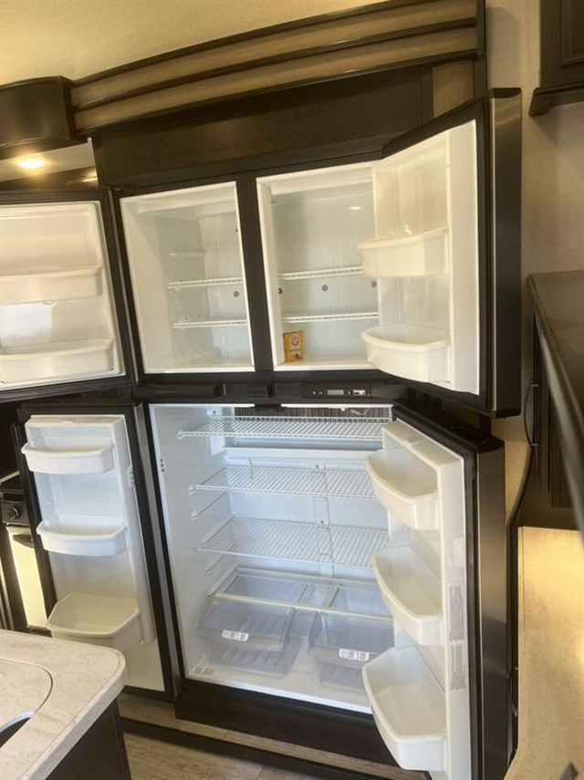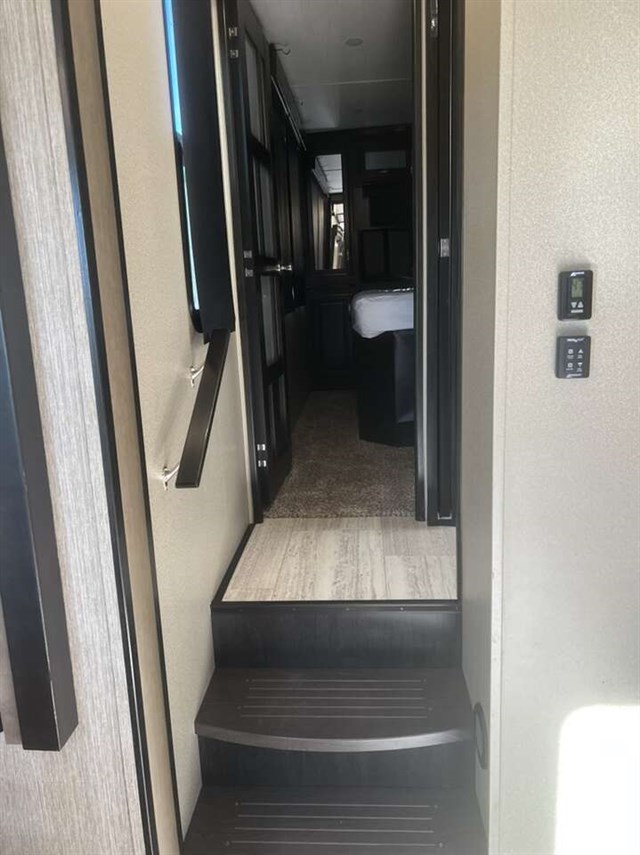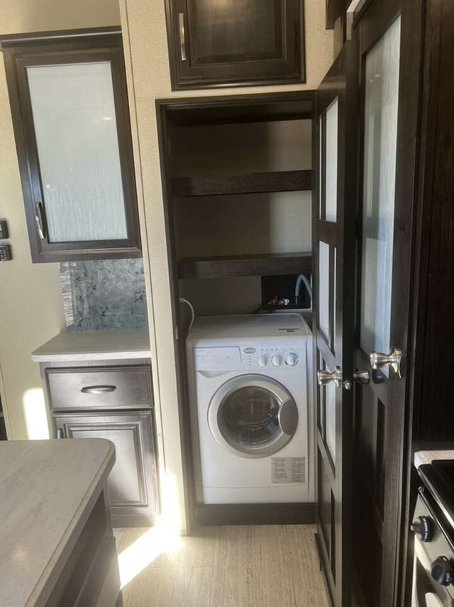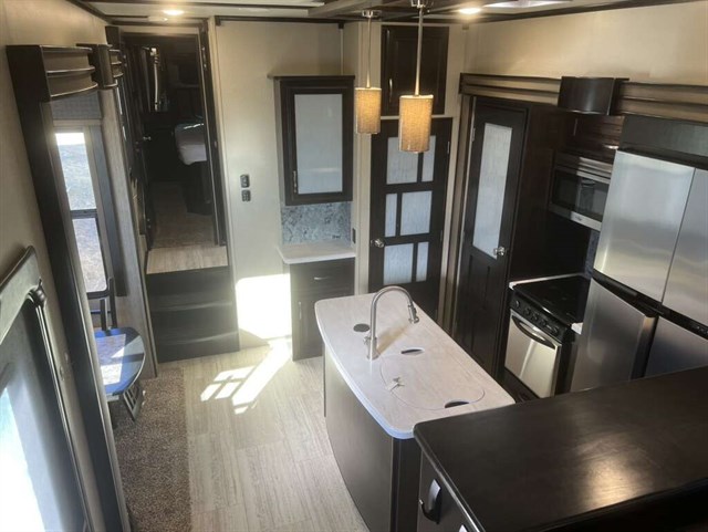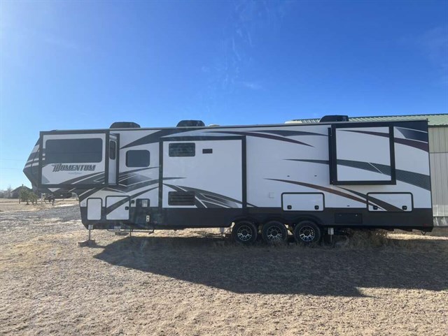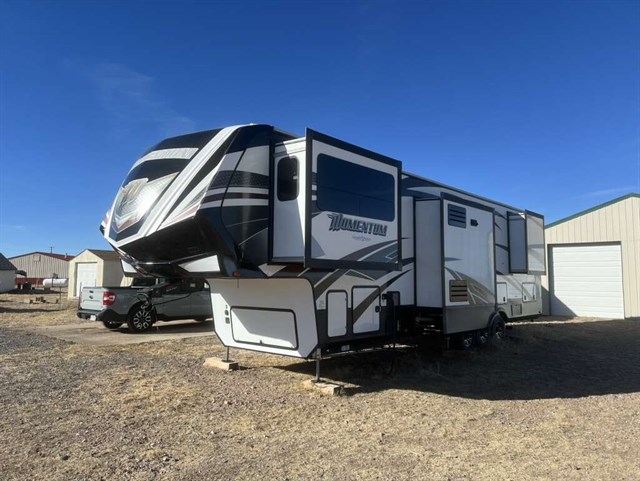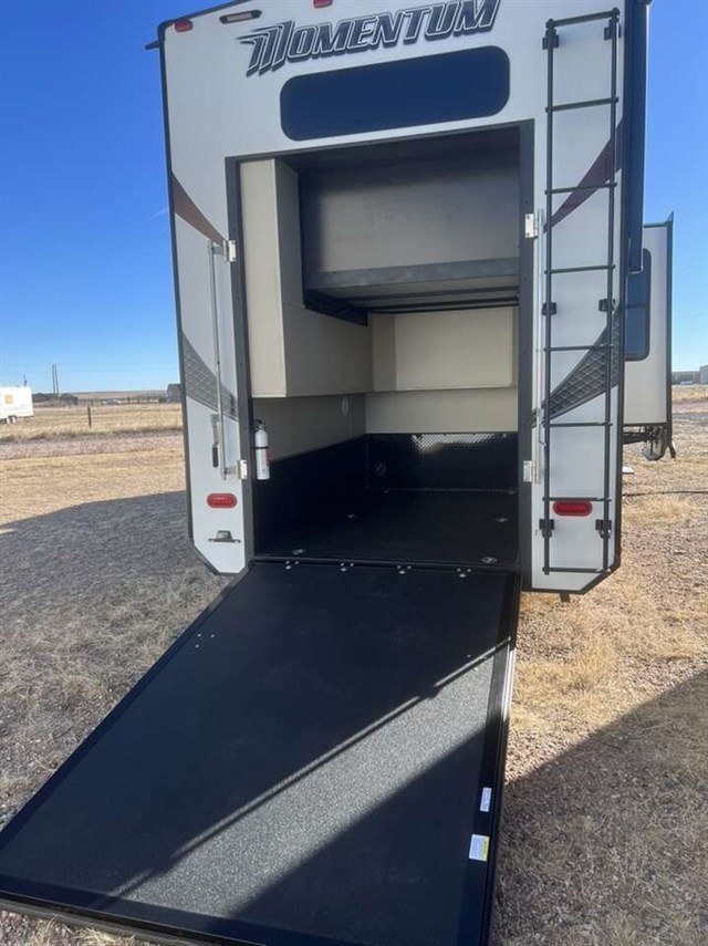 When you are ready for some off-road fun, hitch up this toy hauler fifth wheel to head to your favorite trails! This Momentum 376TH has a unique below floor garage with a bedroom above. After a busy day on the dunes, you can entertain guests in the front living area which includes a telescoping 49" LED TV with fireplace. You will find the separate kitchen area has all the amenities necessary to make and eat meals including a free standing dinette and large pantry. You even have a washer and dryer in the second pantry if you want to keep your clothes clean the whole trip. You may choose to watch the exterior LED TV under the stars..There is much more to see inside and outside this toy hauler!
