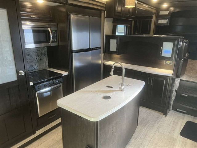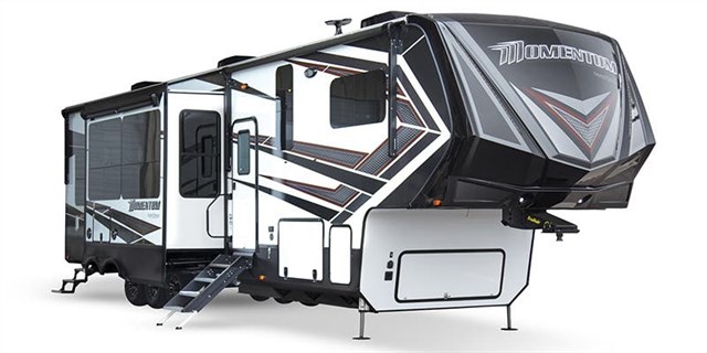 With any Momentum toy hauler fifth wheel you will enjoy extraordinary living with extreme playtime with the Weather-Tek insulation for four seasons of protection, and a fully enclosed fuel pump station to keep the fun going the whole time. The Tuff-Ply garage flooring is gas and oil resistant and includes 2,500 lb. rated flush-mount tie-downs to keep your toys secure while moving down the road. The interior includes a sofa with headrest and removable swivel table, a convection microwave, a central vacuum system with tools and a dust pan, and a satellite/solar roof access channel to mention a few highlights
