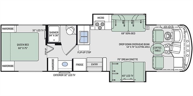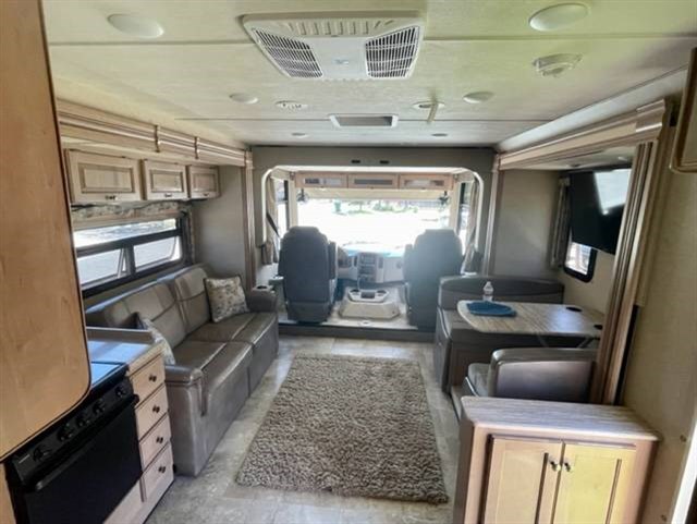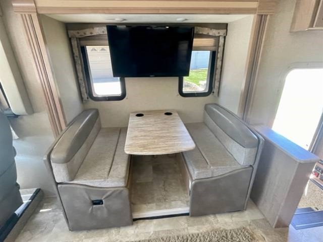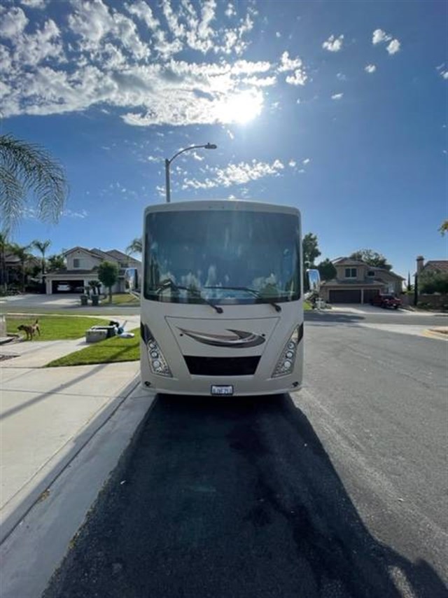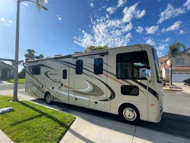 This RV is approximately 32 feet 9 inches in length with 2 slides, exterior TV, Ford Triton V-10 engine and automatic leveling jacks. New features for 2018 include updated décor, thicker solid surface counters, raised bathroom vanity, flush covered glass stove top, LED running & marker lights, pre-wired for solar charging, power driver seat and more. Optional equipment includes the beautiful partial paint HD-Max high gloss exterior, dual A/C, 50-amp service and 5.5KW generator. The Thor Motor Coach Windsport RV also features a tinted one piece windshield, heated and enclosed underbelly, black tank flush, LED ceiling lighting, bedroom TV, power overhead loft, frameless windows, power patio awning with LED lighting, night shades, kitchen backsplash, refrigerator, microwave and much more!