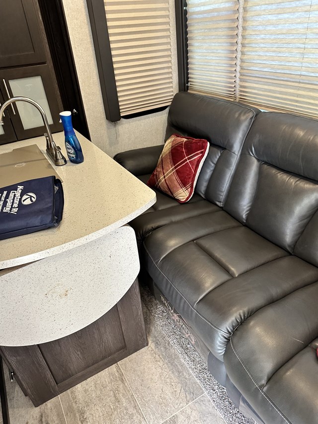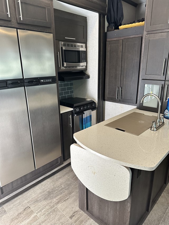 The cook of the family will absolutely LOVE this Carbon kitchen! There is a 12 cu. ft. refrigerator for your perishables, extra counter space, a double sink, and a three burner range. You will be able to prep meals and cook them here, and then you can enjoy the meals on the 97" sofa that has a dinette table in front of it. You will love how much space is in this living area with the dual opposing slide outs! This model also has a loft with a twin bed which I am sure the kids will fight over! Don't worry though because there is an electric bed in the back with dual opposing sofas that fold down into a couple of sleeping space as well, which as just as cool as the loft. Mom and dad will have the private front bedroom and the queen bed all to themselves, plus there is a private entry into the bathroom for convenience.