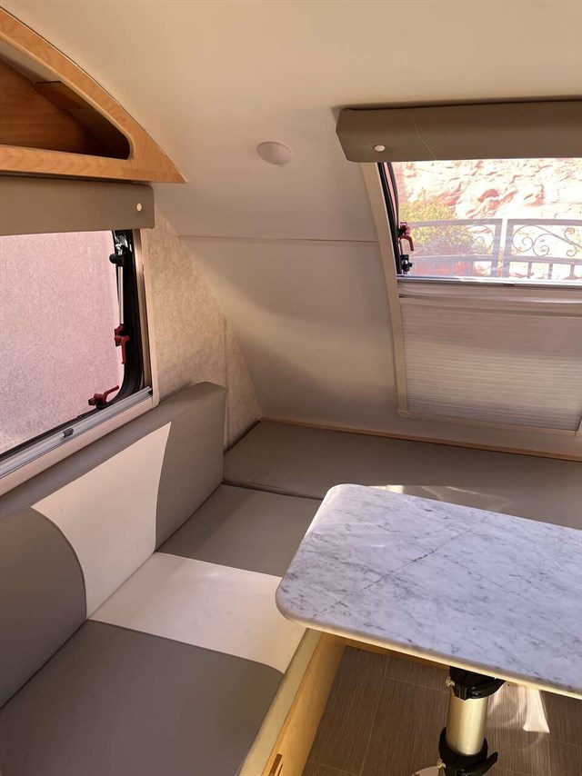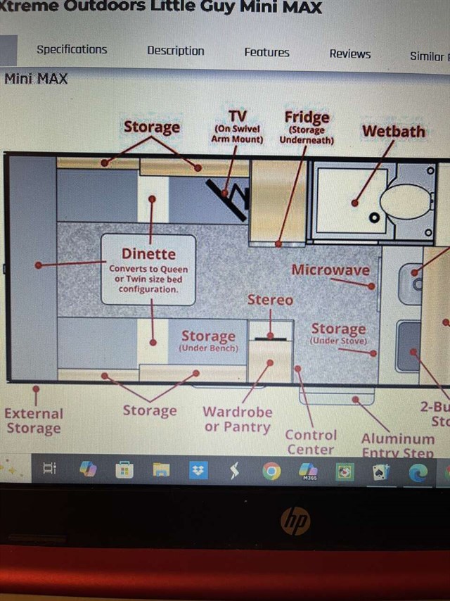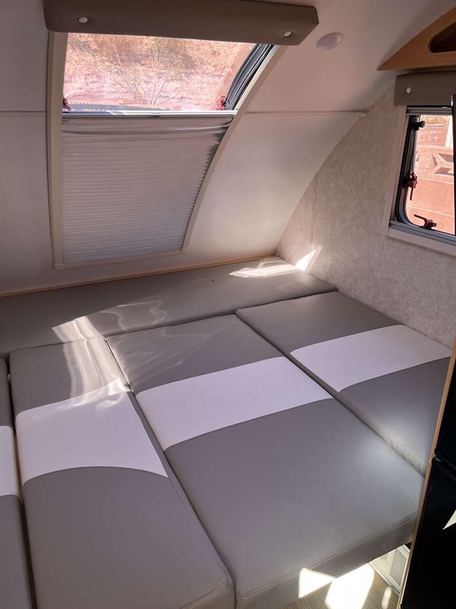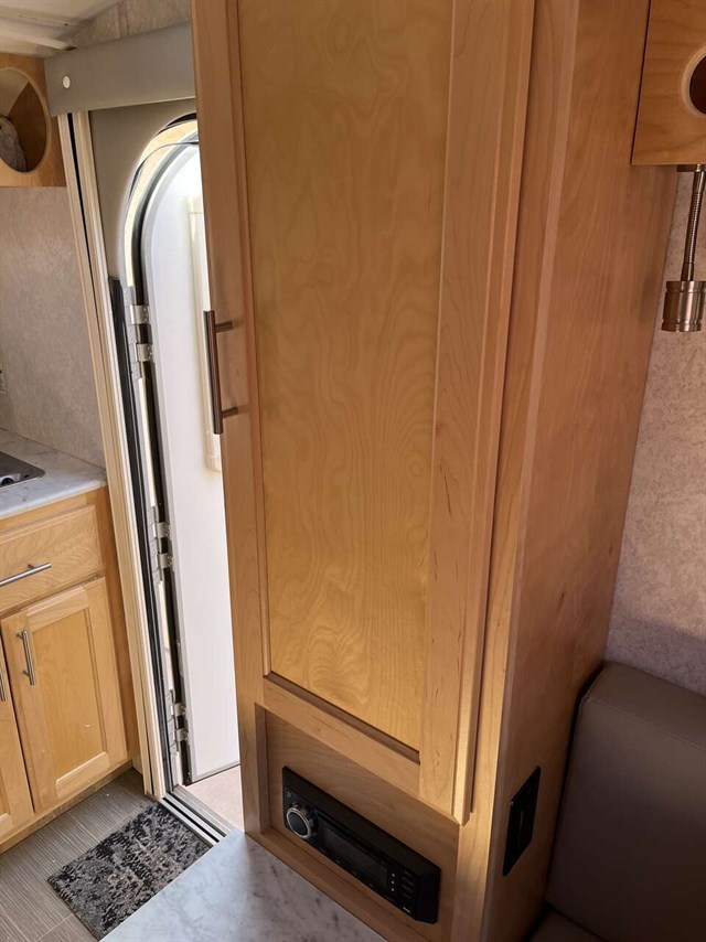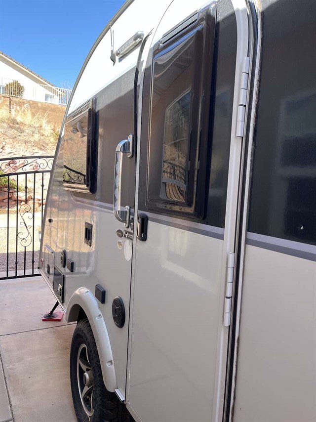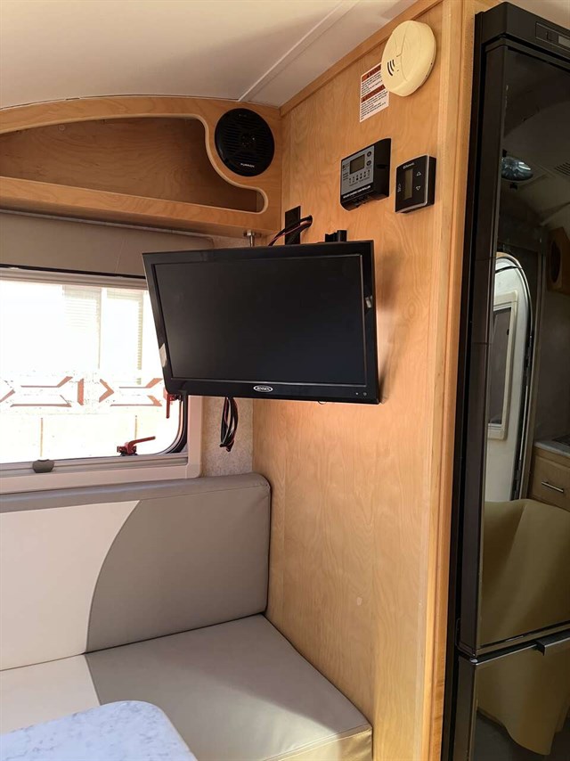 This model has solar panels. Trailer has been taken out a total of 7 times and is in perfect condition. A wonderful home away for home for glamping. TV can transfer to outside hookup on the side of the trailer. Also has an outside shower nozzle and hook up awning for over the door.