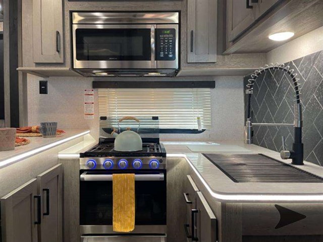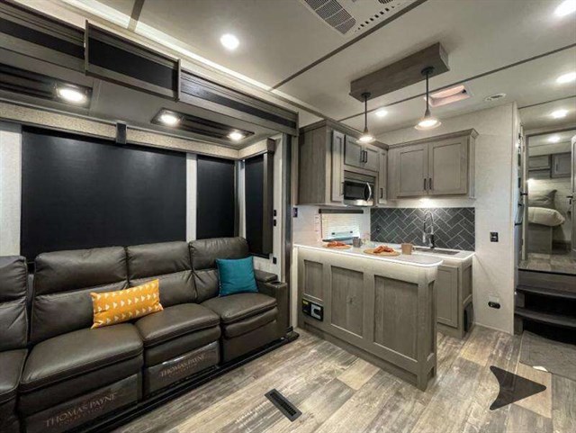 Inside and outside comforts can be experienced every time you hit the trails with this Raptor toy hauler. The 13' separate garage gives you the traveling storage you need for your toys, and then it becomes the second inside living and sleeping area. The opposing sofas and electric bunk, the TV, the half bath, and the space prepped for the washer/dryer allow you to travel as long as you wish. The raised patio gives you another choice when wanting to relax outdoors and visit with other campers, and you also have two awnings along the exterior to relax underneath. Back inside, you can make meals in the kitchen using the convection microwave, serve meals from the U-shaped countertop, relax on the sofa with recliners, and fall quickly to sleep on your own queen-size bed in the front master suite.