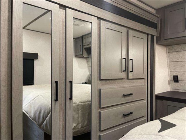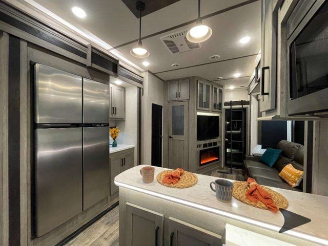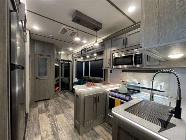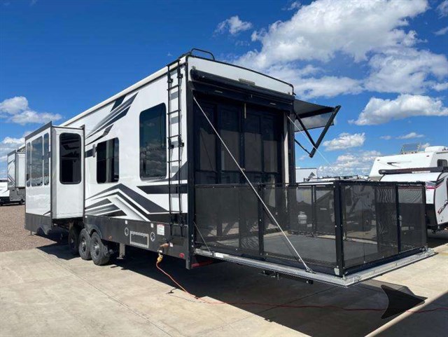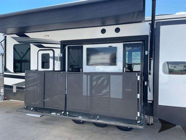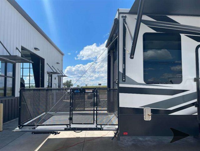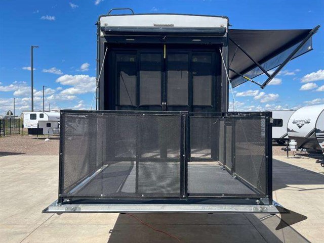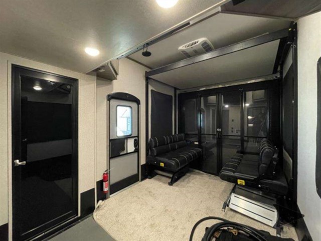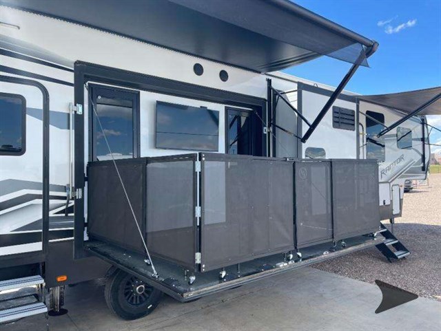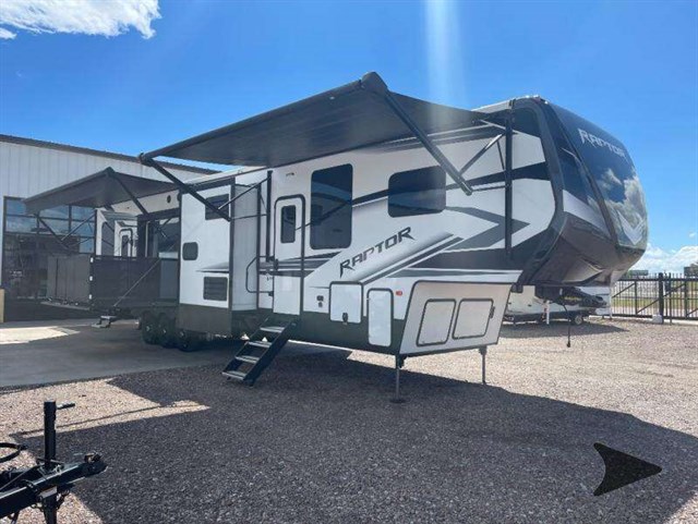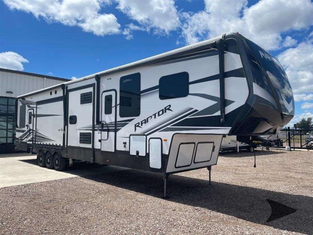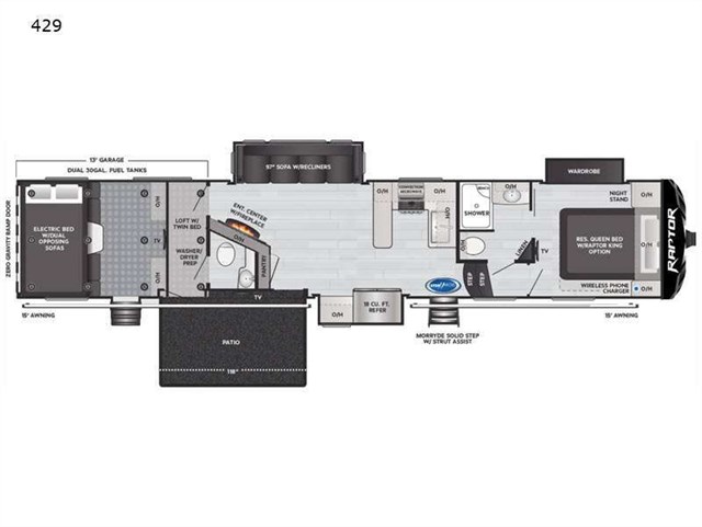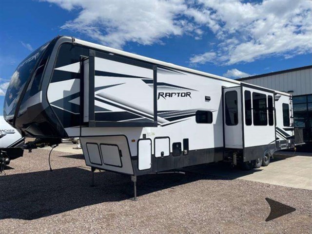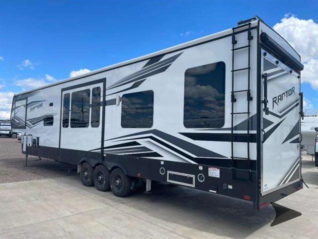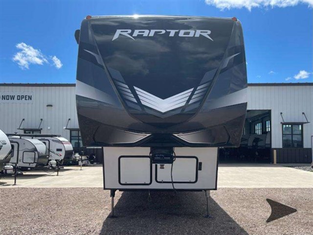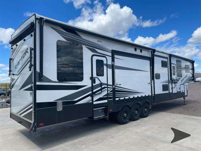 The Keystone Raptor toy hauler has rugged flexibility that will entice any adventurer! The Raptor's sophisticated design makes it an attractive choice for anyone, and the hardworking innovation makes it suitable for all thrill-seekers. No matter who you are, the Raptor has something that you'll love, like the wireless phone charging station, on-board fuel station, Zero Gravity ramp door, Onan 5,500W gas generator, and Furrion wireless back-up camera. The heated and lighted pass-through storage area gives you an additional space to place your gear, and the outside shower allows you to rinse off your toys or muddy boots before coming inside. The Raptor also has a few Keystone-exclusive features, like the Tru-fit slide construction, KeyTV, and Tuf-Lok thermoplastic duct joiners.