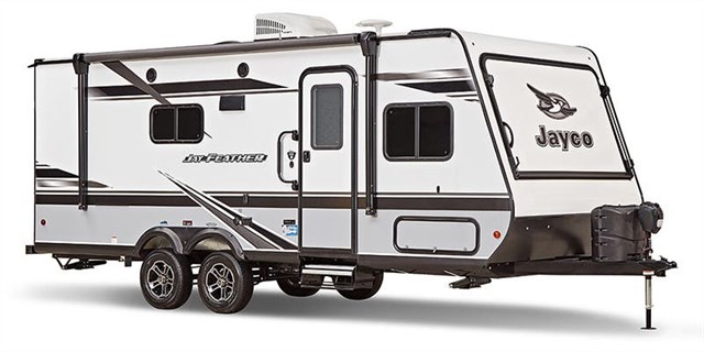 The Jayco Jay Feather travel trailers provide peace of mind with a superior construction process offering Stronghold VBL aluminum-framed vacuum-bonded lamination on every sidewall, rear wall and slide room wall on an American-made Norco frame with an integrated A-frame. Also included are American-made Goodyear tires and Dexter axles with self-adjusting electric brakes and galvanized steel wheel wells, and a 3/4 flush-mount fiberglass cap with blue LED lighting. The Sport Package is mandatory and offers a roof ladder, enhanced graphics package, roof-mount solar prep, and the Glacier package to mention a few features. The interior provides screwed and glued cabinetry, LED lighting throughout, a decorative backsplash and smoked glass decorative inserts on select overhead cabinets for style, plus much more.