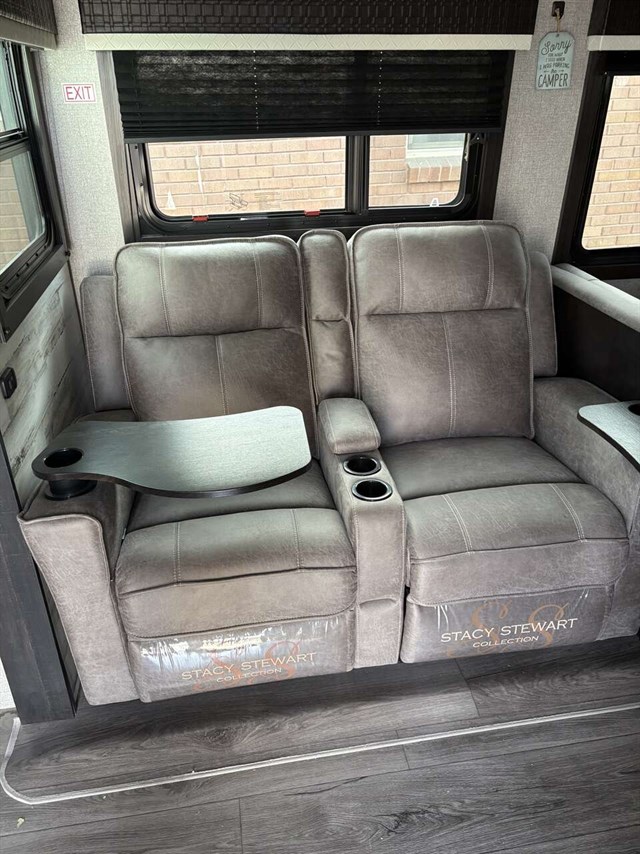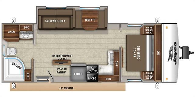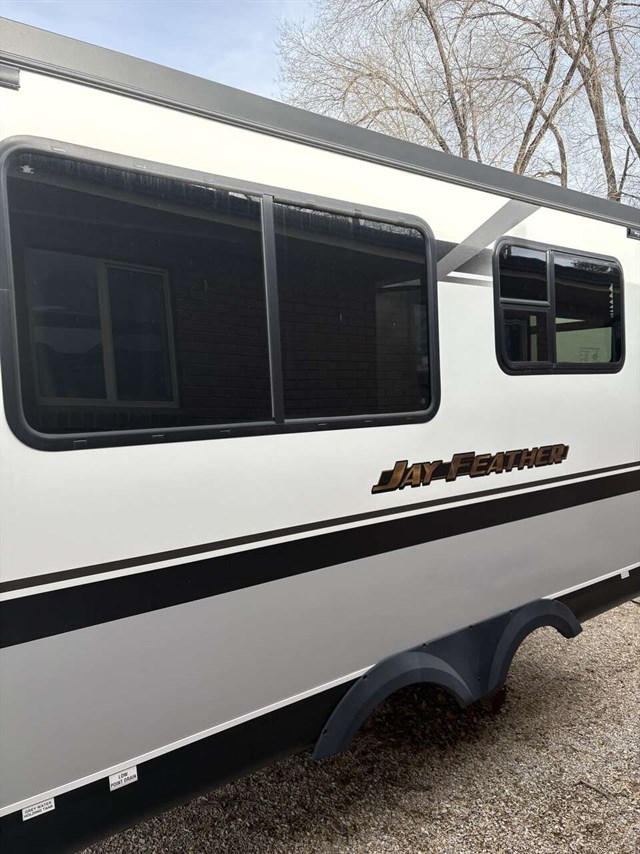 Looking for a family trailer or a couple's retreat? This Jay Feather offers a private bedroom with a walk-around queen bed, dual nightstands and wardrobes as well a space savings sliding door. The spacious rear bathroom gives you plenty of linen storage, a 34" radius shower, and everything you need to skip the public facilities. You can make meals at the L-shaped kitchen with a 6 cu. ft. refrigerator and Furrion range including an oven and three burner recessed glass cooktop, plus relax on theater seating. Outside the 19' power awning with LED lights gives you an outdoor living and dining area, just add your camping chairs and table.