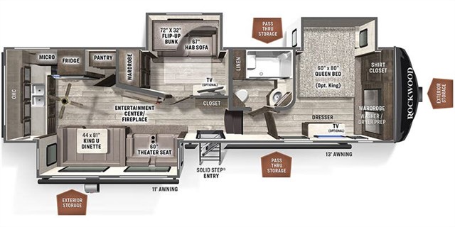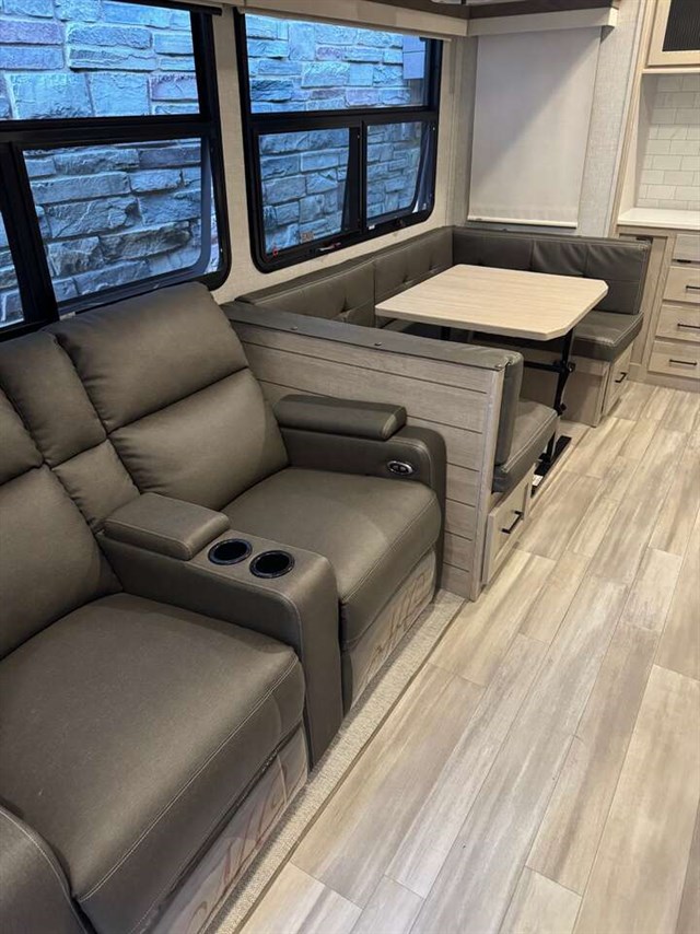 The middle bunkhouse offers a place to work, rest and sleep with a counter space, sofa, and flip-up bed, and there is a wardrobe for clothing. The large bedroom up front provides a king bed slide , a dresser with a window above for great views, and a front wardrobe, shirt closet and a place prepped for a washer/dryer option. The full bathroom includes a shower with a seat and linen storage, and is located between the two rooms. You can watch the LED TV with fireplace below from the slide out which includes a king U-shaped dinette and theater seating. The cook will enjoy their own space in the rear kitchen with full amenities including a large pantry, an 11 cu. ft. refrigerator, and great views out of the slide out windows.