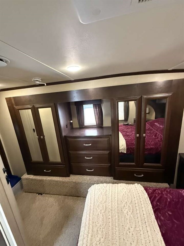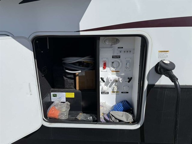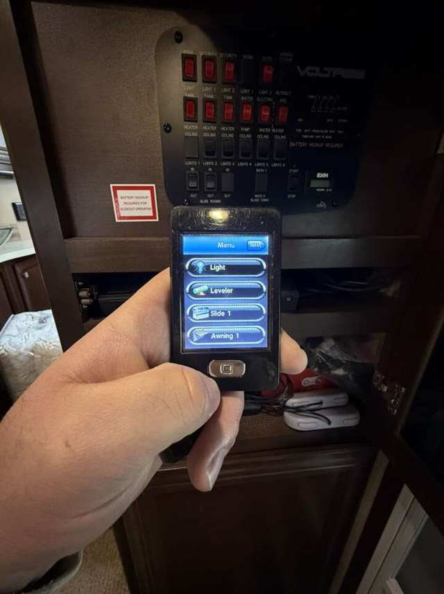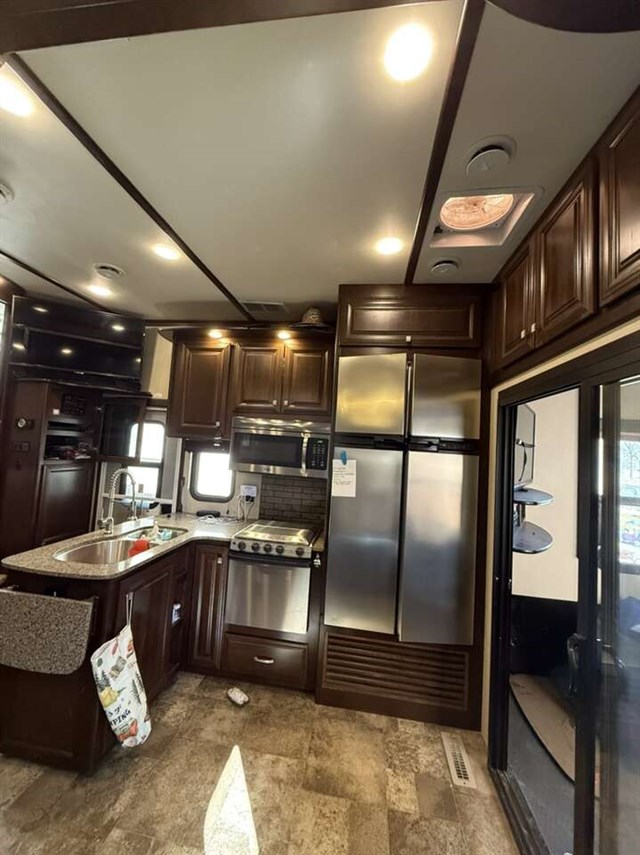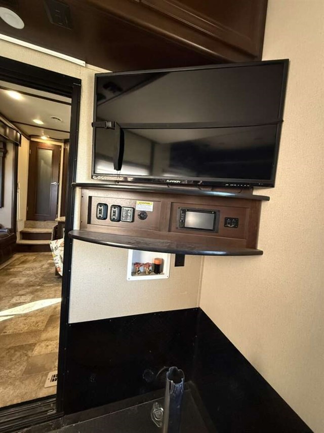 18 foot garage!! Everything is the trailer works perfectly. Trailer tows great, good tires. No problems with this unit. It has a 160 gal fresh water tank. Two gas tanks, one for the generator and one for toys. Trailer has the back deck, 3 beds in the garage area. Double fridge, queen bed in the master bedroom, 4 tv’s, and outdoor control system for the radio. It also comes with a LCI handheld controller which can control the leveling system, awnings, side out, and accent lights.