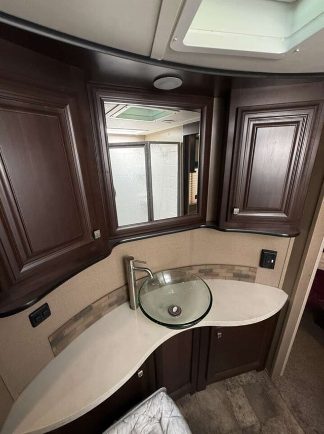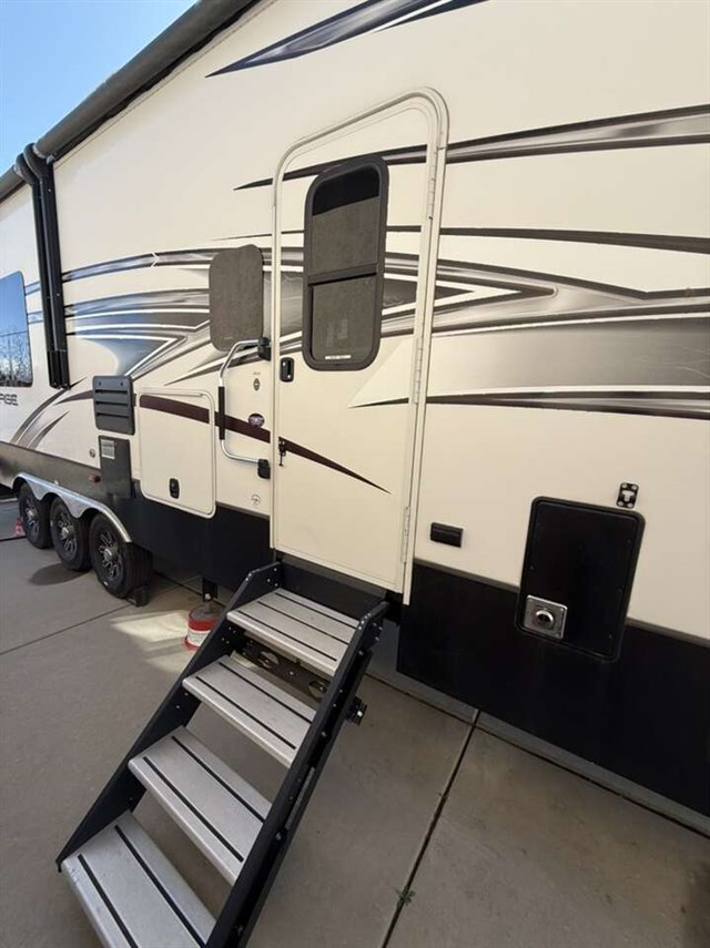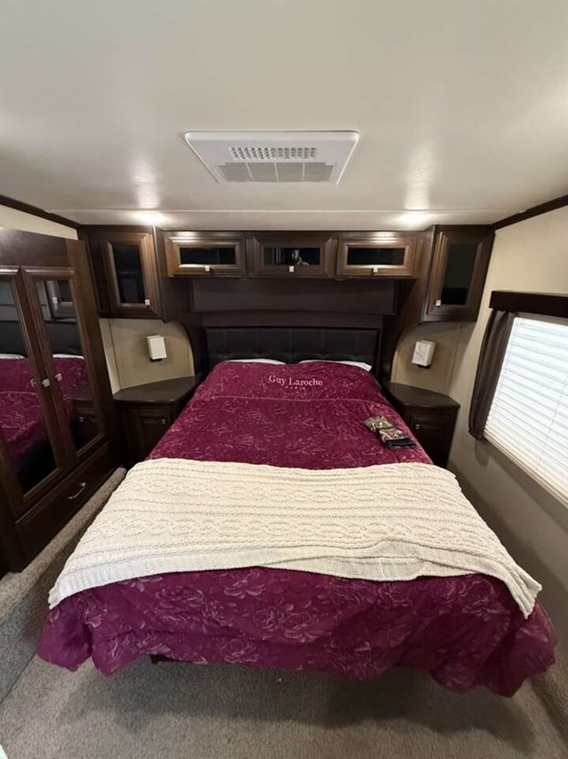 43 feet in length with 2 slides, toy hauler, 5.5KW Onan generator, 2 power patio awnings, gas/electric water heater, pass-thru storage with side swing baggage doors, aluminum wheels, keyless entry, exterior shower, tank heater, automatic leveling system, exterior entertainment center, day/night shades, convection microwave, solid surface counter, central vacuum, 3 burner range with oven, all in 1 bath, glass door shower with seat, bunk beds, 3 ducted A/Cs and much more!