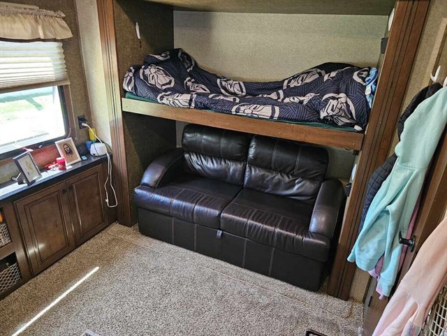 Here you have a camper ready to go for any family fun adventure! With its five slides, you can expect a spacious hangout for everyone!! Including a nice dinette, reclining couch to relax in, and a lounge to enjoy a nice book or magazine with ample amounts of led lighting. When time comes for bed, you'll find a comfortable king-size bed awaiting. While having a large closet behind your mirrors to hold any and all your clothes/belongings. Prepped for a washer/dryer as well! In the back, your kids will enjoy their personal full bunk room and half bath with its own entrance! Having two slides in the back to open it up, providing tons of floor space for some fun! Outside, you have a large kitchenette providing cabinet storage, sink, mini fridge, and your exterior burners! Camper has power jacks front and rear. Another perk is the ample amount of space for storage! Inside and out! On the rear, you'll find a tandem pulling receiver and a 7 pin plug.