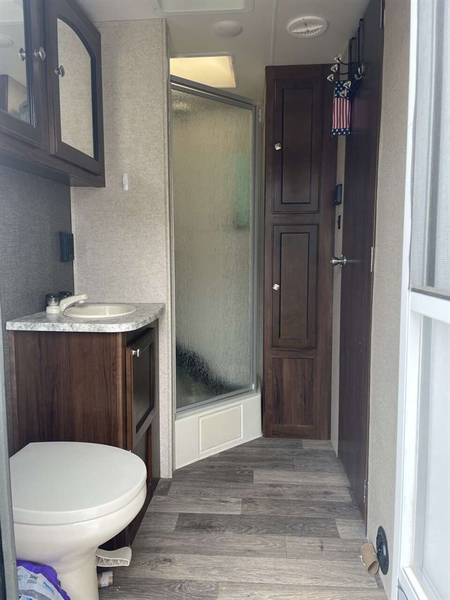 It has a full bathroom with a toilet, a shower, a sink, and a medicine cabinet. You don’t have to worry about finding a campground with facilities or using public restrooms.