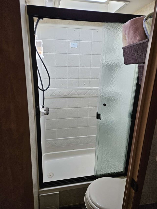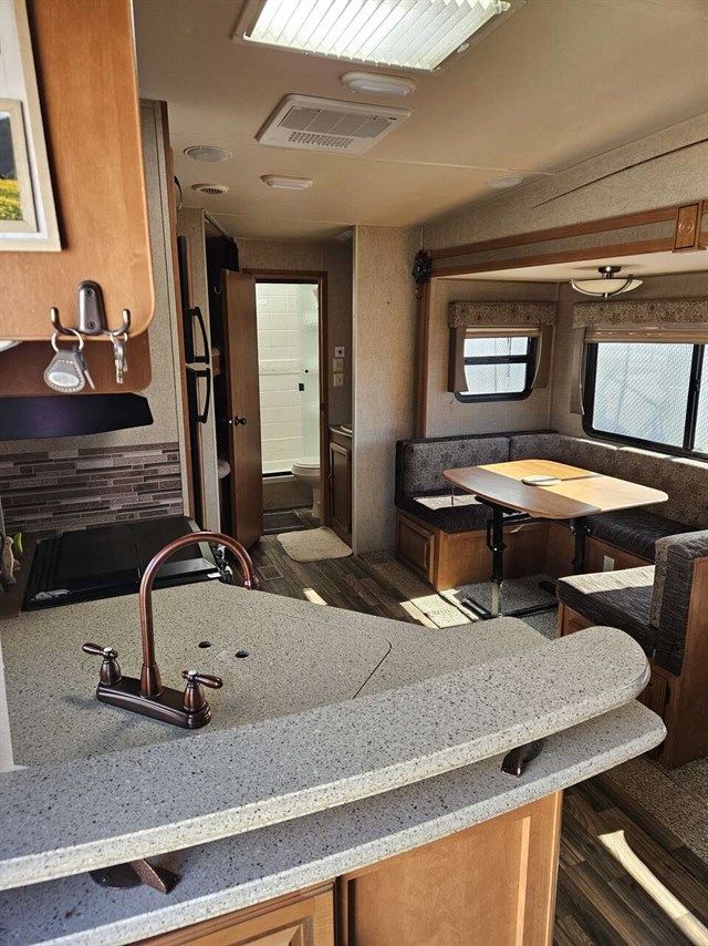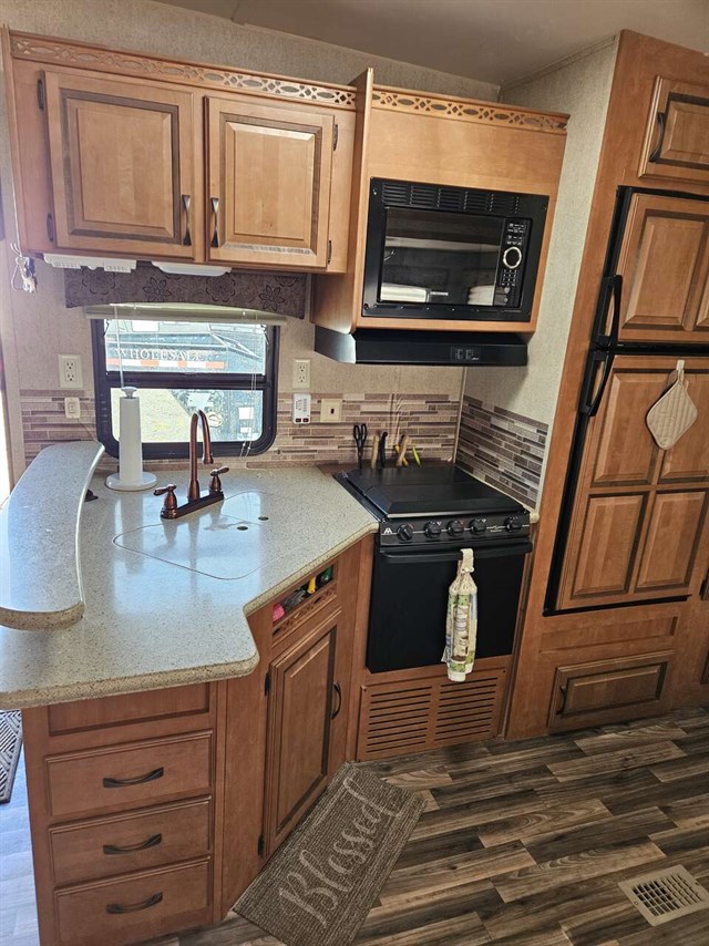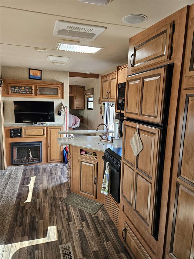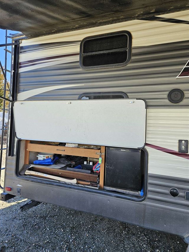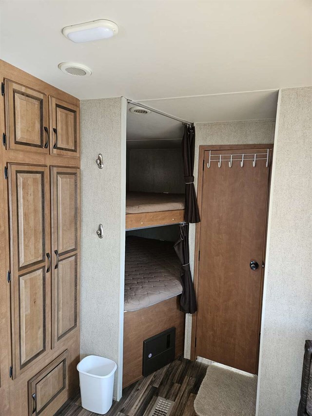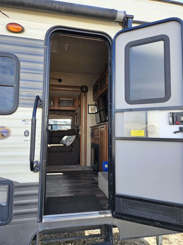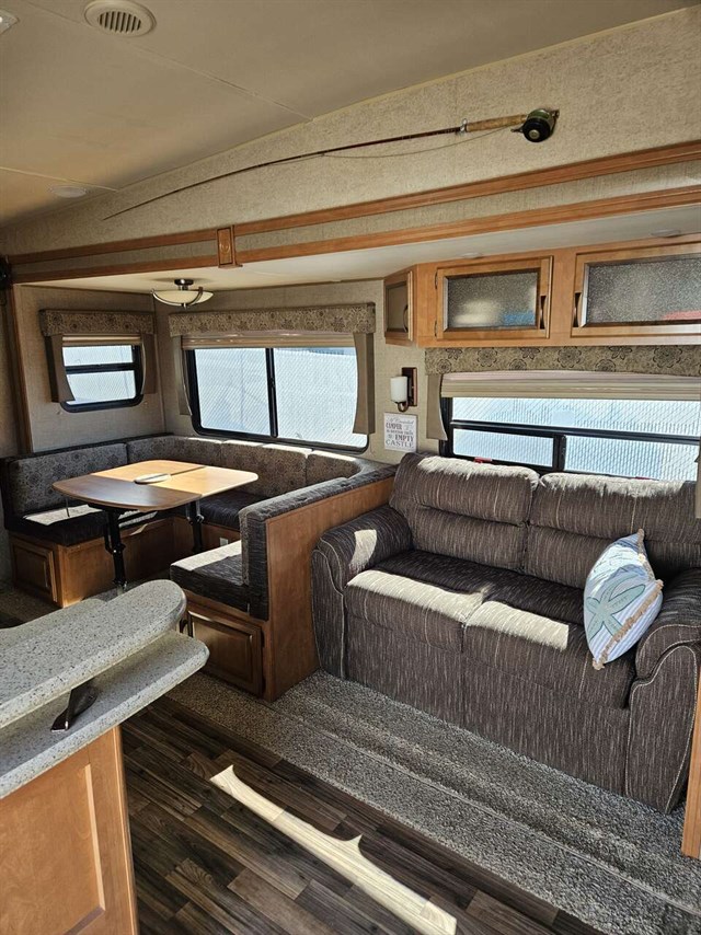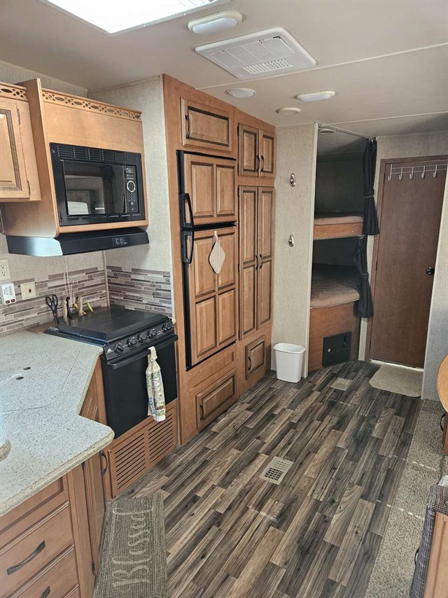 28 Ft., 2016 5th Wheel, Double bunks in back, love seat makes into a bed and dining table drops down for a bed. Bathroom in back with sliding shower doors, fireplace, TV, DVD player, new tires, new master mattress, fridge, freezer, microwave, large pantry area, lots of storage. Outdoor kitchen and shower. A/C & furnace and much more!