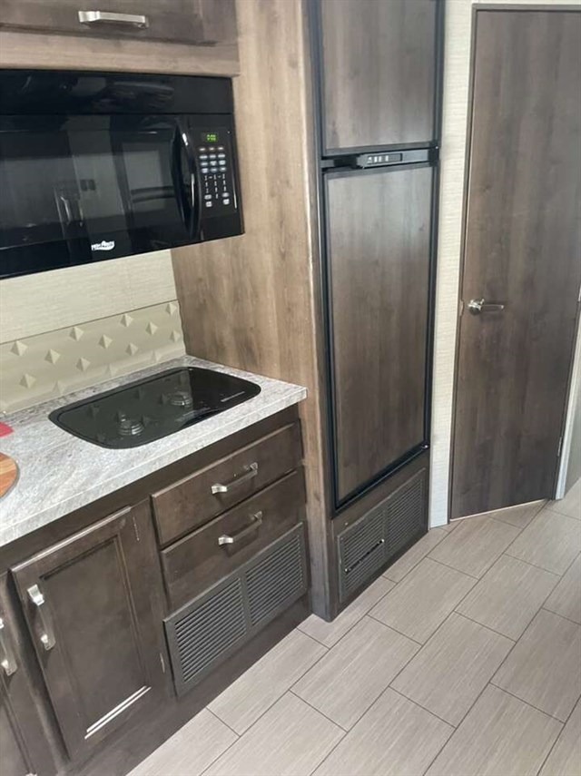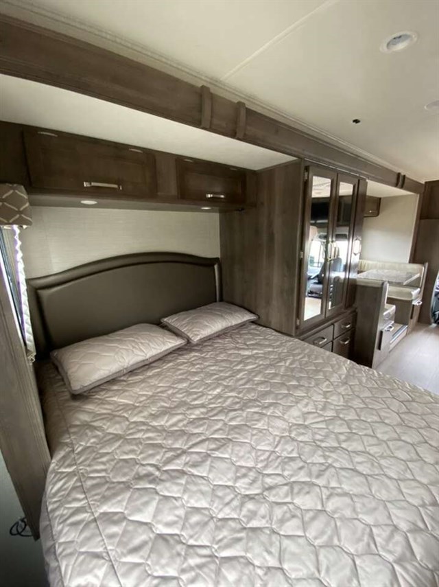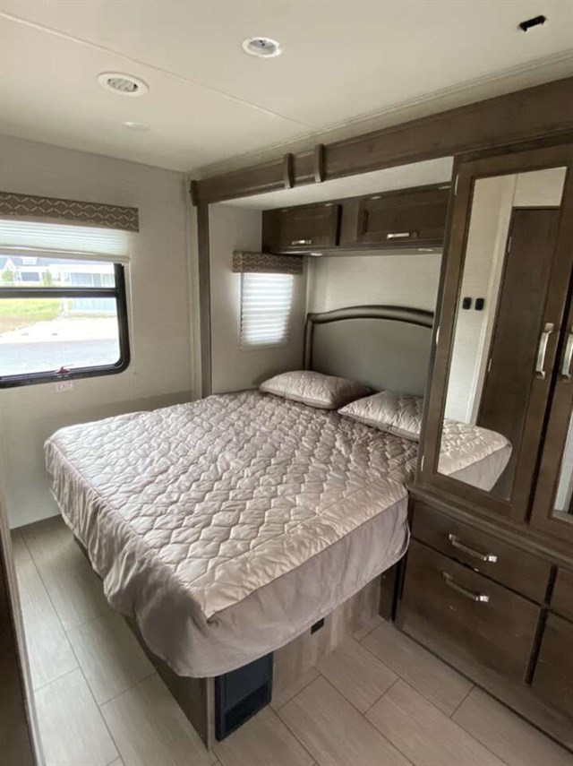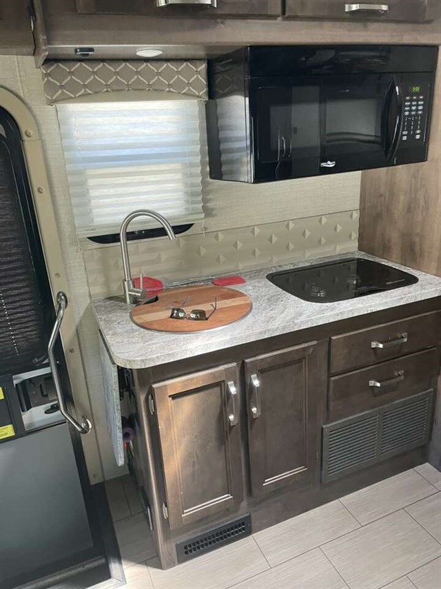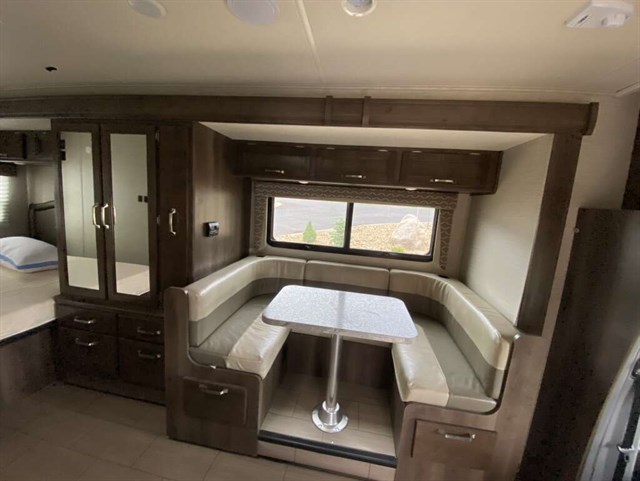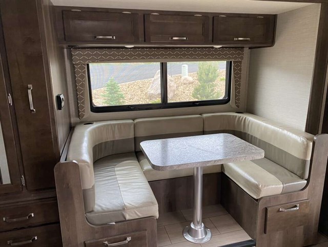 With any Melbourne class C coach all of your travels will seem a whole lot easier. The interior is homey and inviting and provides all the space you need to enjoy time inside when the weather doesn't cooperate with your outdoor plans. You will appreciate the LED lighting throughout, and comfortable seating. The bath embraces residential style and includes laminate countertops, a combo tub/shower, and even a skylight to bring in more natural lighting. You will find optimal storage both inside and out with overhead cabinets throughout, base cabinets in the kitchen as well as under the dinette seating, and in the mesh pockets for books and magazines. On the outside, enjoy a spacious pass-through storage compartment for all of your travel gear, an outdoor shower to rinse off your feet or the family pet before heading inside, and an LED lit electric awning for easy outdoor entertainment at night, plus so much more!