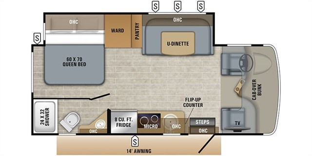 Hit the road and enjoy the freedom to come and go as you please knowing you have everything you need with you! This Melbourne class C diesel coach gives you all of the comforts needed for travel. On the inside, you will enjoy the added space thanks to a large full wall slide out along the driver's side. A spacious U-shaped dinette assures that everyone can enjoy comfortable seating for a meal or even games. The cab-over bunk will be a favorite spot for the kiddos to play, nap, or just hang out on a rainy day inside. And, with a full bath on-board, plus the kitchen amenities, you will surely enjoy those longer trips knowing you can all keep fresh and clean and prepare the kind of food that you love most! At night, take pleasure in a little outdoor fun under the 14' awning that features LED lighting so you can stay out and enjoy the twinkling stars and sounds of night.