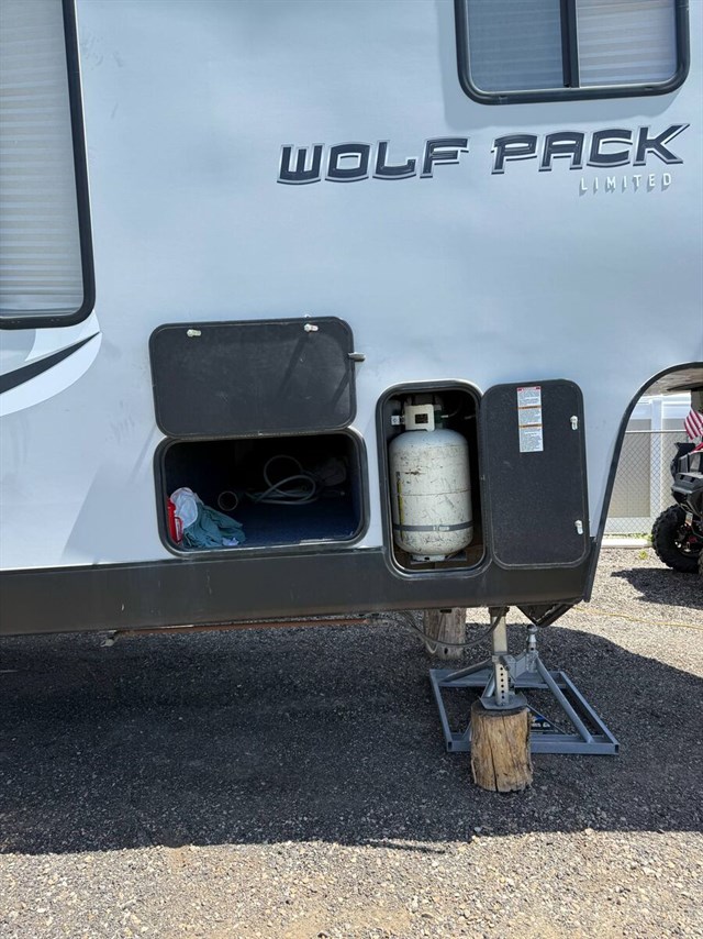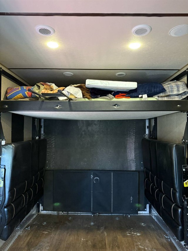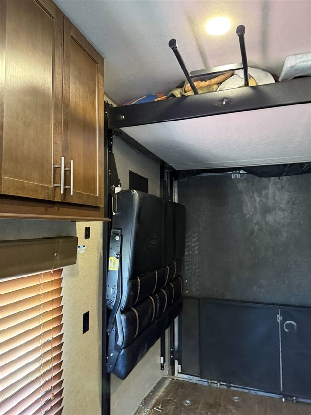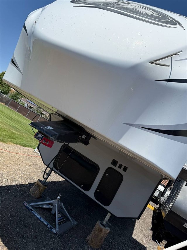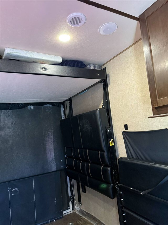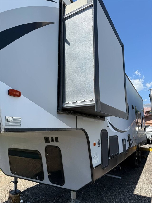 I'm selling this trailer. It's too big and we are going to downsize. Everything works as it should. The length is 36' and the garage is 18'.