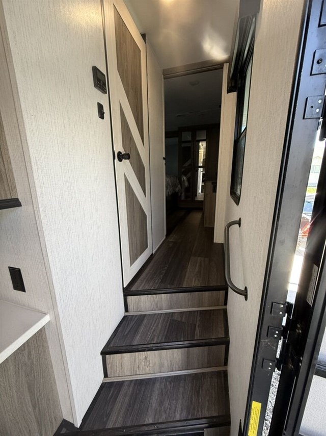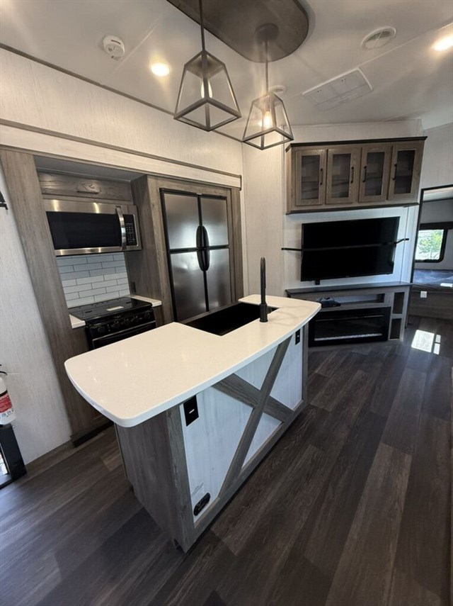 You won't believe all that this fifth wheel has to offer! Starting with the dual entry doors which one of them enters directly into the half bathroom so you can get back to having fun outside fast. The half bathroom also enters into the rear private bunkhouse which has a set of 54" x 74" bunk beds with a loft above them. The kitchen/living area has everything you need to feel right at home between the sofa, the free standing table and chairs, pantry, kitchen island, and 40" electric fireplace with accent lighting. Everyone can freshen up each morning in the full bathroom with a shower with a seat and a power roof vent to eliminate any unwanted steam. You could even grill the catch of the day outside with the outdoor two burner cooktop while staying protected by one of the two electric awnings!