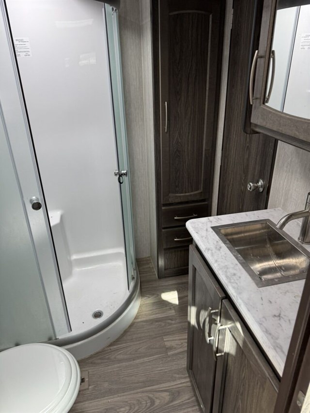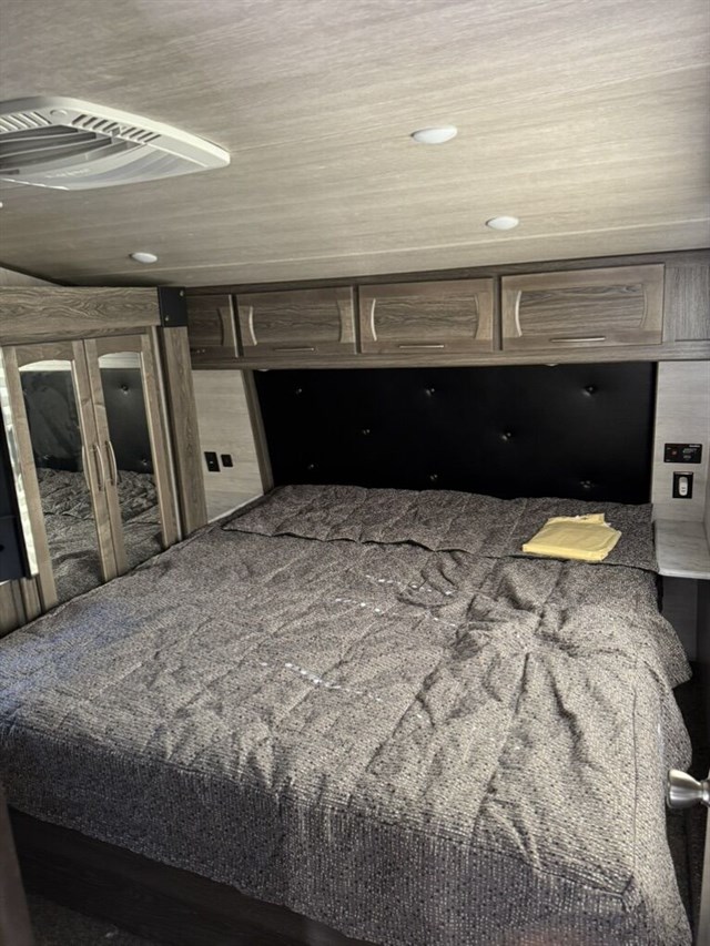 If you want to get away for the weekend with your toys, get away with this Vortex toy hauler. It has a 16' 4" garage to keep your ATVs and dirt bikes secure while you travel. You can accommodate a group of six for sleeping with the king-size bed, power queen bunk, and sofas, and everyone will benefit from a hot meal prepared on the three-burner range in the kitchen. You can even keep your cold items fresh by storing them in the refrigerator. The dual-entry bathroom has a door within the main hallway, but it also has a private entrance that leads into the bedroom.