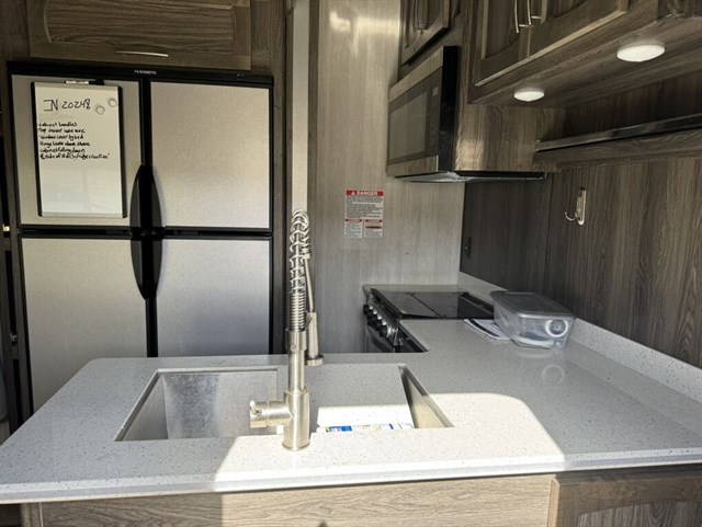 Your camping life is going to be a blast with the Genesis Supreme Vortex toy hauler! These work horses get the job done but also make it fun. You will be able to use the 40-gallon fuel station to gas up your toys when you come back from the trails, and the power awning with LED lights will give you protection as you use the exterior features. The 16" deluxe aluminum alloy wheels will get you to and from your destination with confidence, and the 35,000 BTU furnace will ensure that you don't freeze while you sleep on cool nights. You can keep power flowing with the 4.0kW generator with transfer switch, and you'll also enjoy the function and the style of the solid-surface countertops in the kitchen.