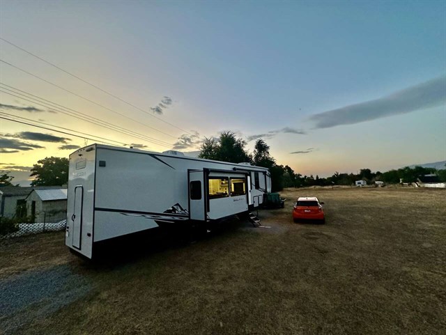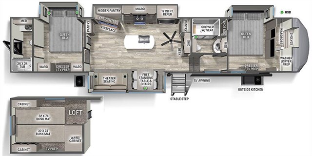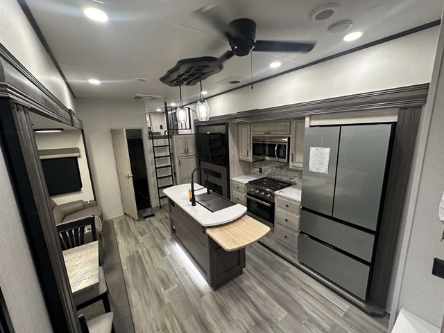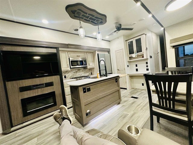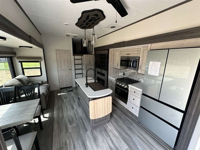 BONUS!: I'm throwing in my favortite propane generator! Awesome for off grid glamping! New, Zero Trips! Layout is perfect for a family of 6! Hidden Pantry! Model: 4002FB VIN:4X4FSES29RJ052809 (clean vehicle history report provided) PAINT & FABRIC PROTECTION included The 4002FB is a double queen bed and loft coach. With 4 slide outs and a double bunk loft, this floor plan has enough sleeping space for whoever wants to tag along. Rear entry into the 2nd full bath will offer full amenities without cluttering or using the master bath. The island kitchen and theater seating provide a great space to entertain and unwind. The 4002FB model is extremely versatile, utilizing the extra bedroom or loft for storage when the sleeping space isn't needed. Hitch Weight 2,340 lb. GVWR 15,500 lb. UVW 12,889 lb. CCC 2,611 lb. Exterior Length 43' 5 Exterior Width 96 Fresh Water 50 gal. Gray Water 100 gal. Black Water 100 gal. Awning Size 15'