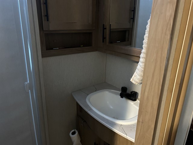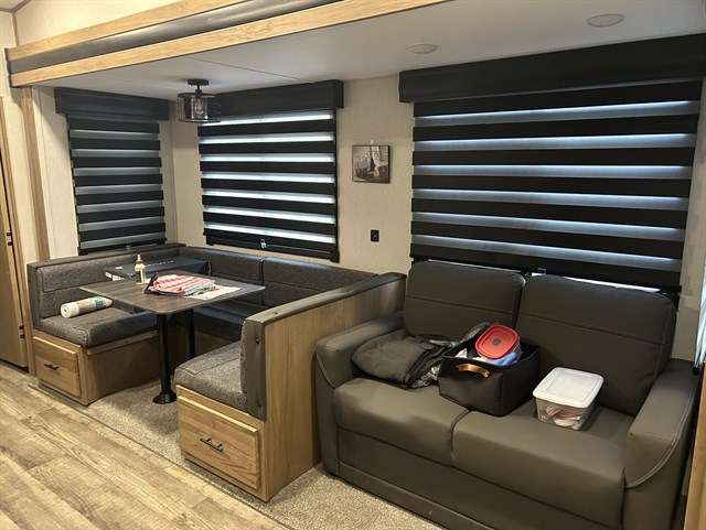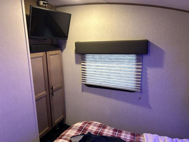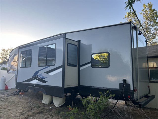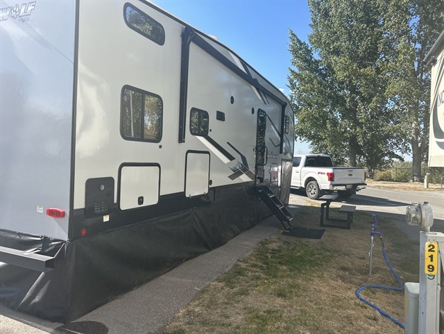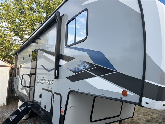 35 foot fifth wheel (8300lbs dry weight), one slide out, solar panels, large 12 volt high efficiency fridge and freezer, microwave, oven, cooktop, auto leveler, master bedroom, second bedroom, fireplace, two air conditioners, three tv's, full skirting. One of the few 5th wheels that can be pulled with a 1500!