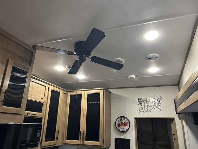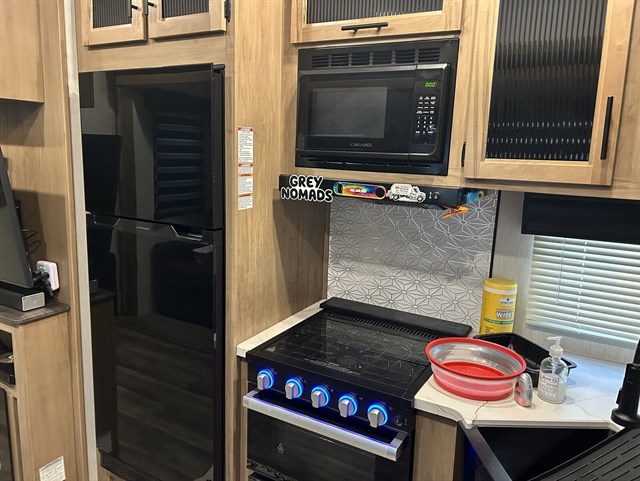 Let the fun times begin with the purchase of this Cherokee Arctic Wolf fifth wheel! You'll have loads of sleeping space for ten tired travelers with the front private bedroom, rear private bunkhouse, U-shaped dinette, and tri-fold sofa. You'll also have excellent storage space with the storage below the lower bunk in the bunkhouse, the large walk-in pantry next to the entry door, the 11-cubic foot residential refrigerator in the kitchen for your perishables, the under-bed storage and large wardrobe in the bedroom, and the exterior open pass-through storage. You'll also have a large slide in the main living area for more living space, and the ceiling fan will cool you down as you are relaxing. Or, if you need to heat things up a bit, you can just switch on the fireplace.