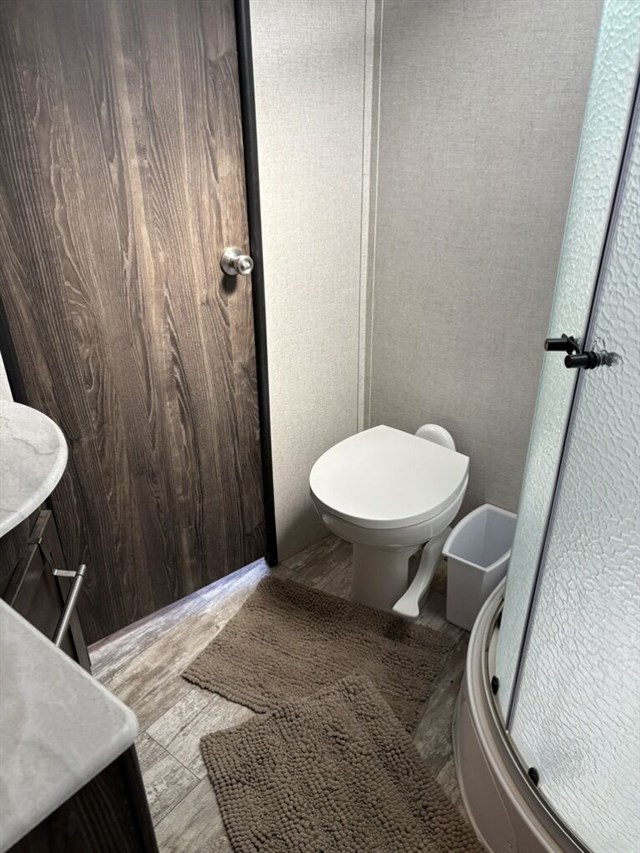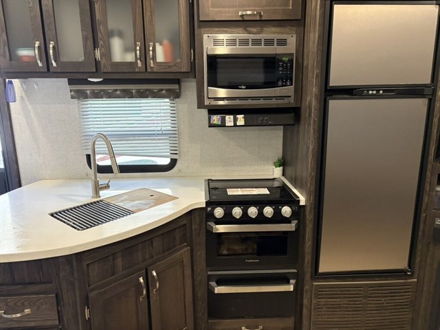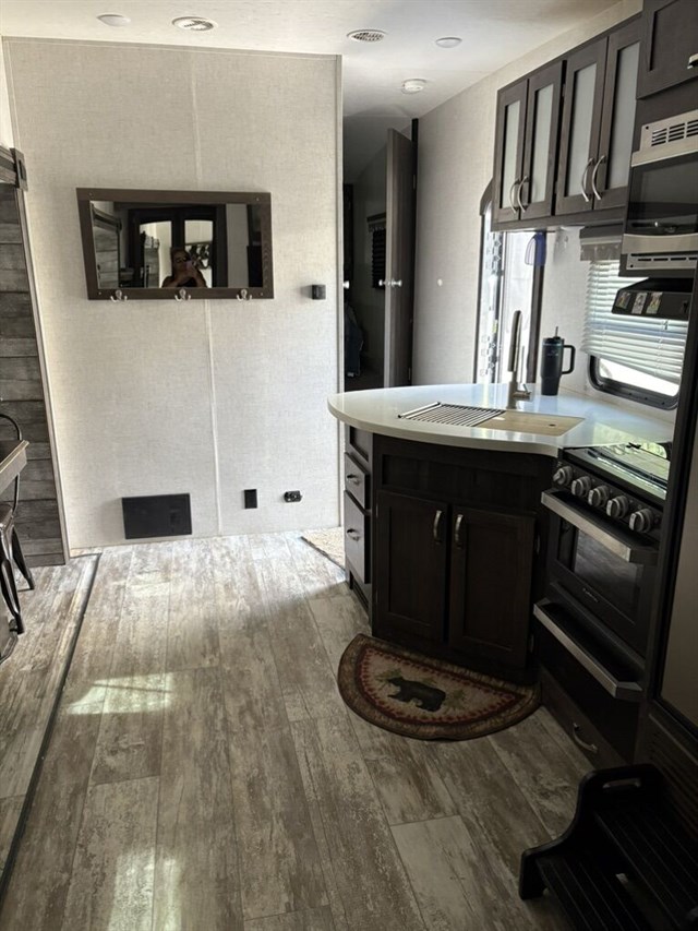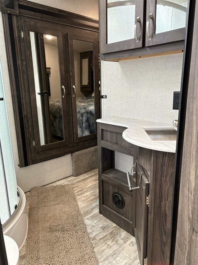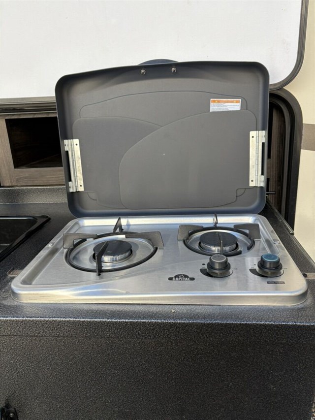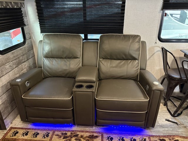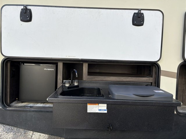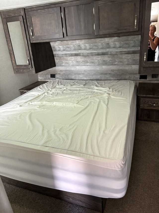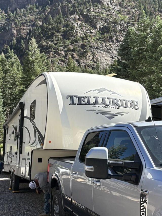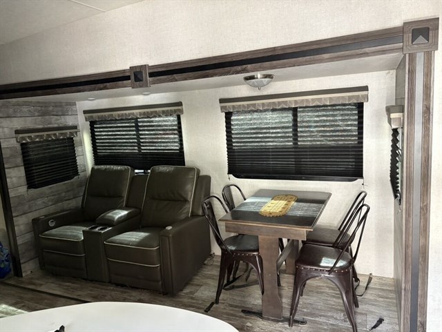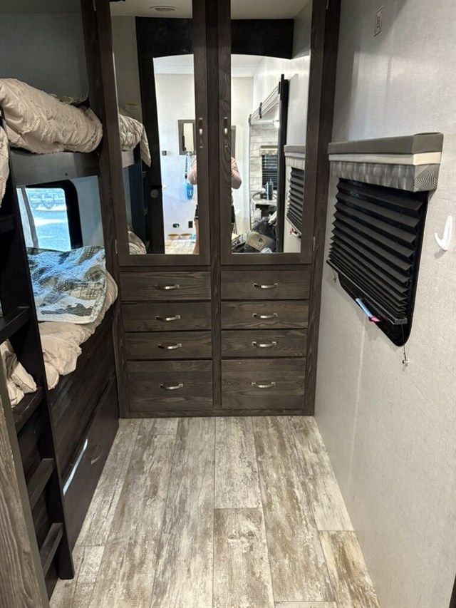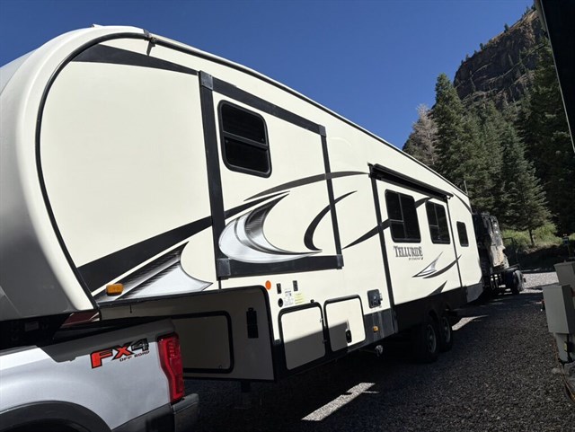 This camper is like brand new, lightly used has never been off road. The bunk room is very roomy with full size bunks and lots of storage under the bunk. We have had this camper for two years but now no longer need the bunk room. Everything works great on it has an electric awning indoor and out door speakers, electric fire place . it does not have the auto leveling but does have electric jacks, brand news tires two weeks old. Heavy duty rear hitch, please call or text with any more questions. We do have the title.