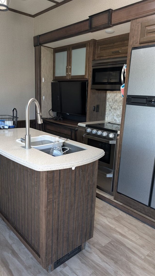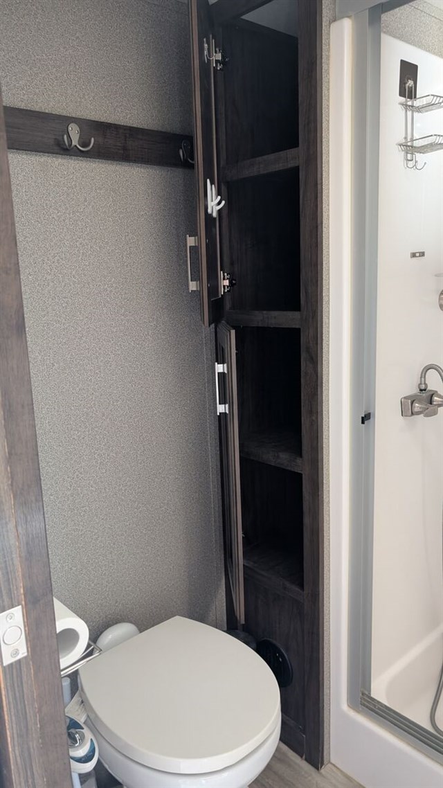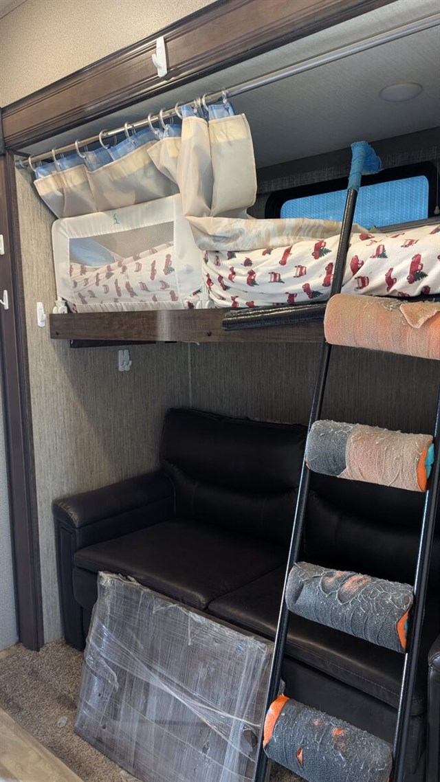 Double the fun can be found in this S-Class! How does having two full bathrooms, two entry/exit doors with one being in the rear of the fifth wheel which is unique, and a super sofa with a tri-fold bed sound in your next extended stay RV? The kids can use the rear bathroom to get cleaned up in after hiking and playing all day with access to their own bunkhouse which includes a tri-fold sofa, drawers, bunk beds, and a fold-down bunk. You will love the chef inspired stainless steel cooktop and oven, the convection microwave, and refrigerator to make meals for the family and your friends. And the fireplace is a nice touch, plus the USB charging outlets will keep your electronics ready for anything. Don't forget about your master suite with a walk-in closet, a queen bed slide and more storage.