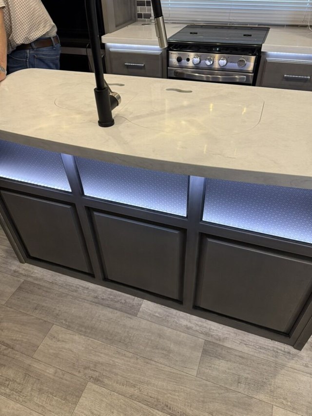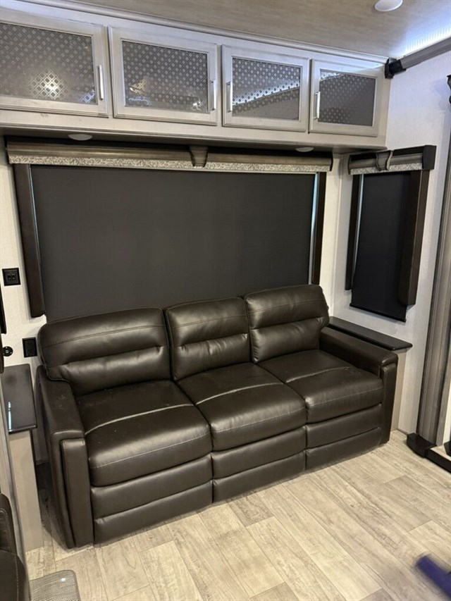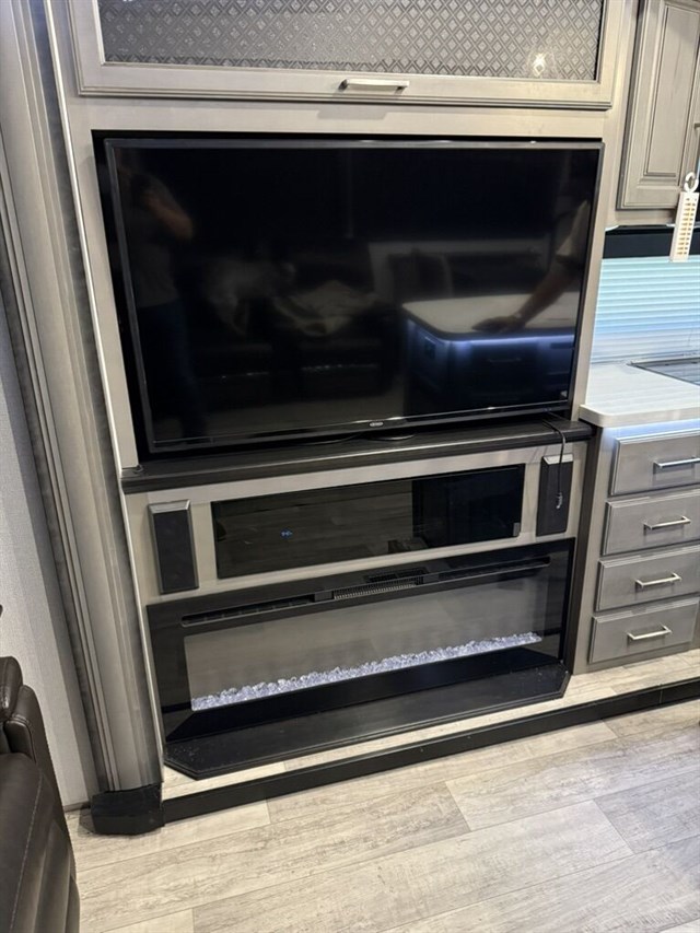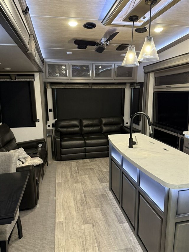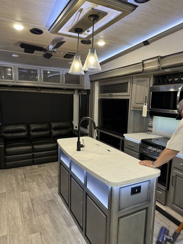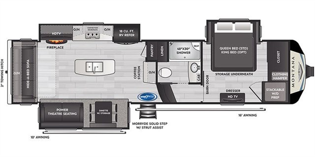 With this Montana fifth wheel, you can have adventures any time! The private bedroom has a barn door that closes it off from the rest of the unit, and the bedroom is fully equipped for comfort with a queen bed slide, a dresser with 32" LED HDTV, a clothing hamper, a huge closet, and an area prepped for the optional washer/dryer. The main living area is also going to feel exceptionally comfortable with its hide-a-bed sofa, power theater seating, fireplace, and 50" LED HDTV. As you spend your afternoon working on dinner, you'll appreciate that the large island provides you with additional prep space, and the coffee station is going to be a fun feature to use both in the morning and in the afternoon for a pick-me-up.