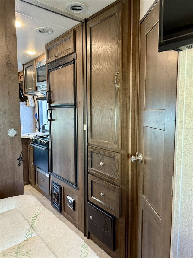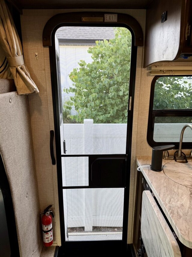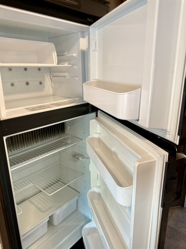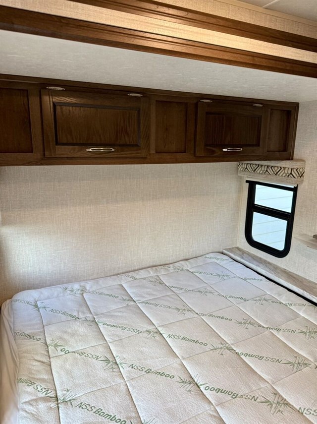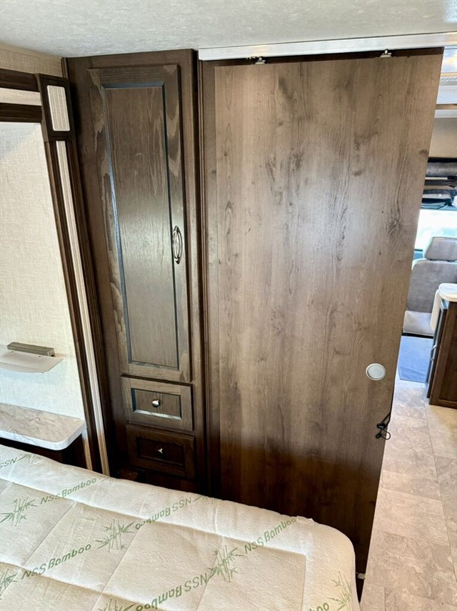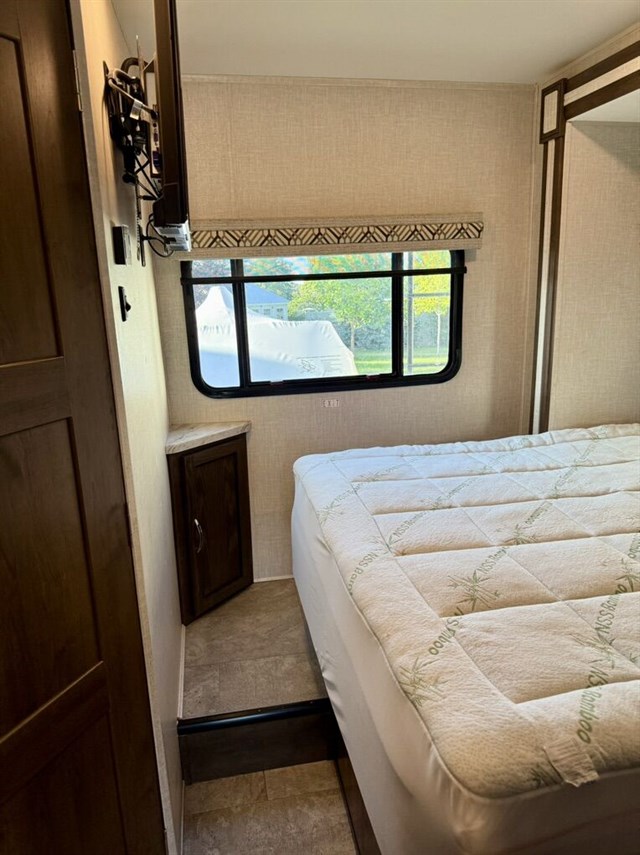 This model has a full walk around queen bed and sliding door to separate from main living area. Highly sought after lay out
