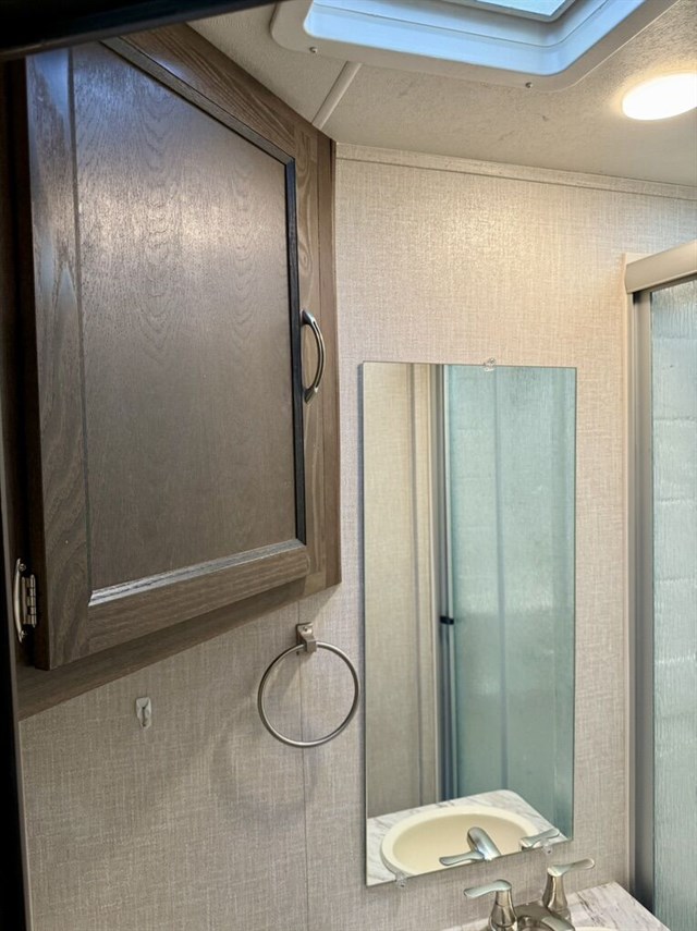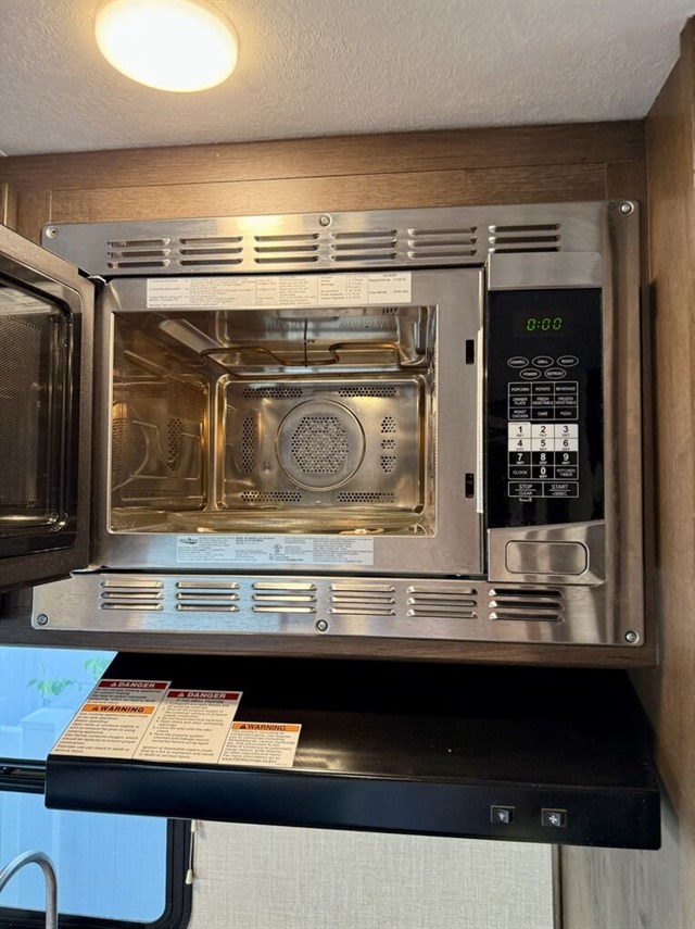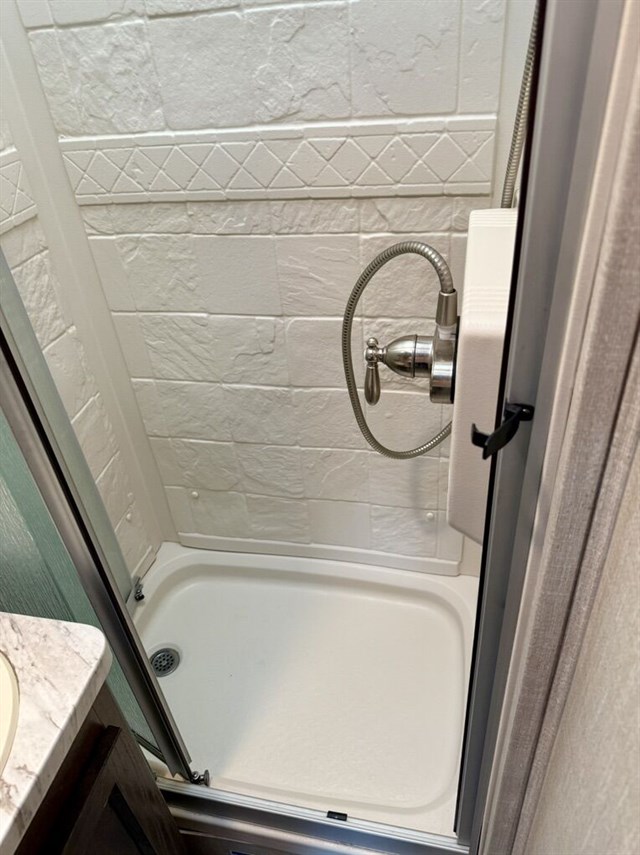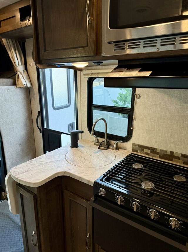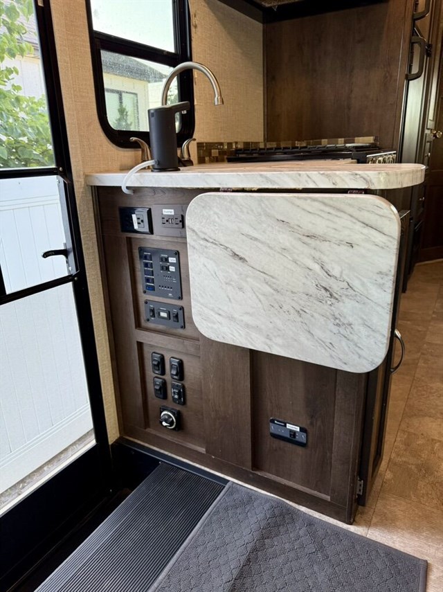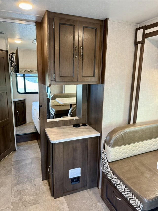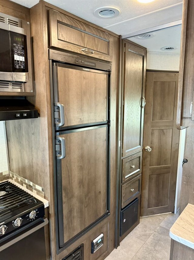 This model has a full walk around queen bed and sliding door to separate from main living area. Highly sought after lay out