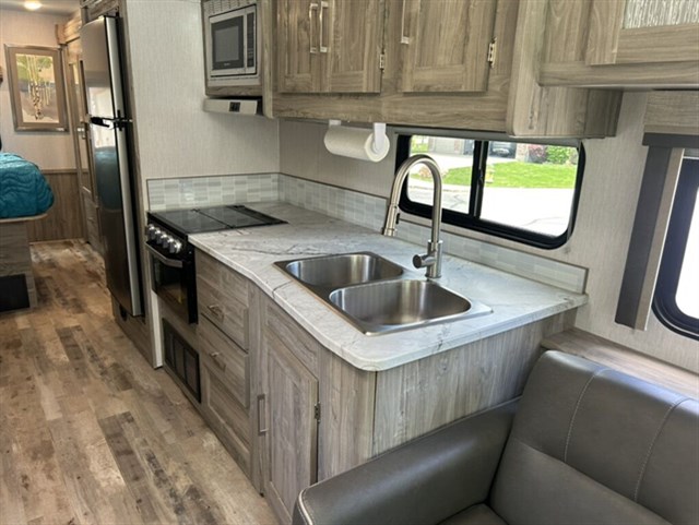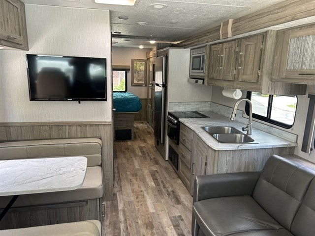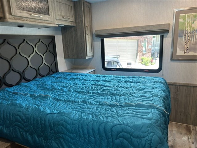 Roomy and comfortable floor plan. Walk around Queen bed with side tables and good /draws/closets. Bathroom is toilet, shower, sink and cabinets in one room. Spacious kitchen with stove, oven, microwave. Nice cabinets, dining and couch area. Over head single bunk.
