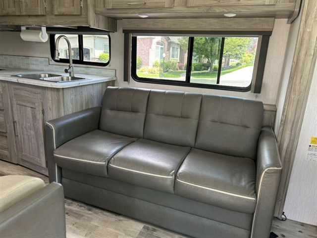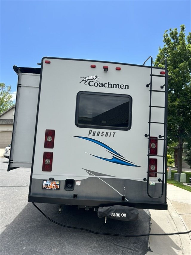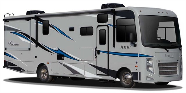 This Class A motor home is approximately 30 feet 3 inches length with a full wall slide, new Ford chassis with 7.3L PFI V-8, 350HP, 468 ft. lbs. torque engine, a 6-speed TorqShift automatic transmission, an updated instrument cluster, automatic headlights and a tilt/telescoping steering wheel. This amazing motor home also features the optional power driver seat and diamond shield paint protection. Each Pursuit comes standard with self-closing drawer guides, hardwood cabinet doors, cockpit table, coach TV with DVD player, pantry, power bath vent, skylight, double coach battery, cruise control, back up monitor, power entrance step, power patio awning, hitch with 7-way plug, roof ladder and much more!