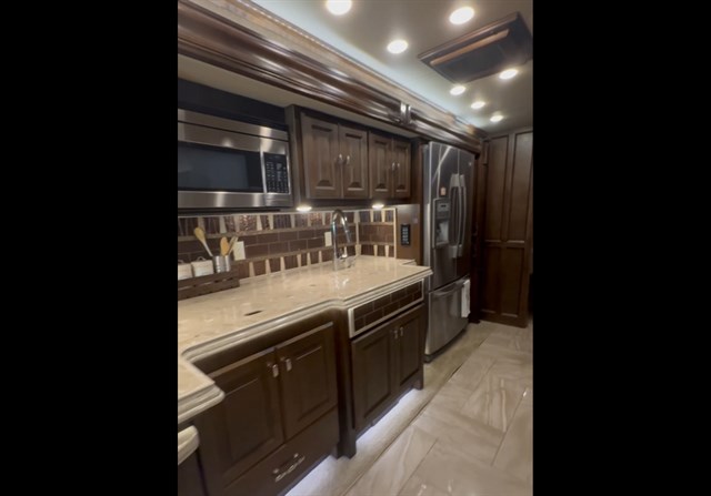 Kitchen: The kitchen features solid-surface countertops, a residential refrigerator, induction cooktop, convection microwave, and a sliding pot/pan drawer beneath a double kitchen sink. Bonus hidden storage includes wine glass racks and spice shelves.