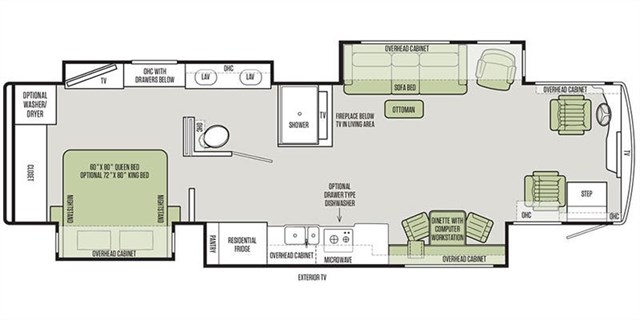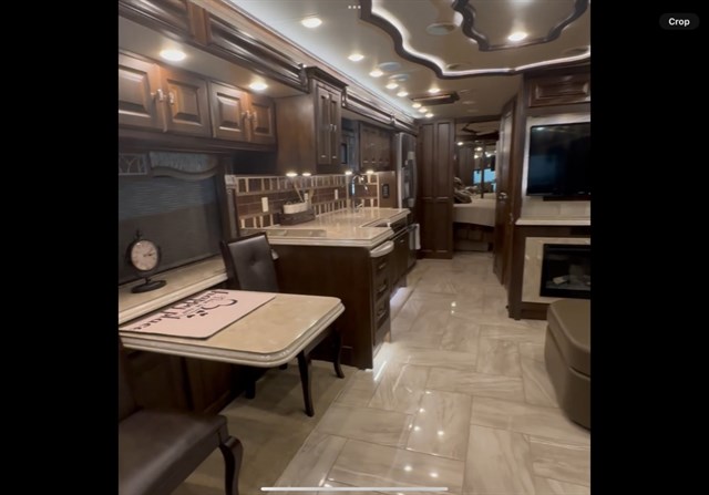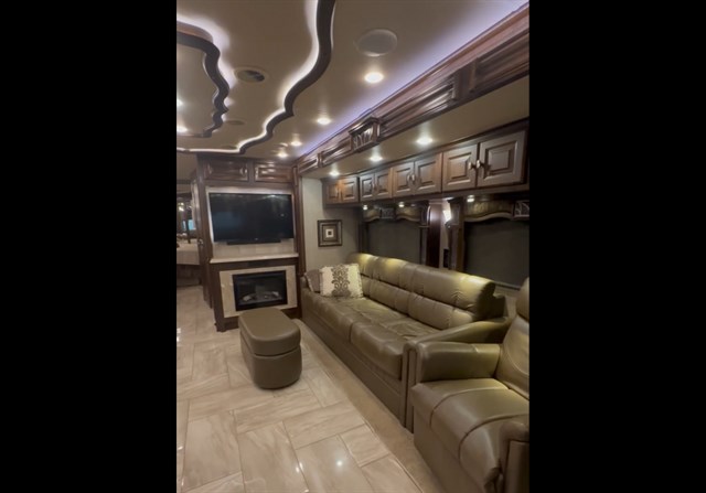 Living Area: Enjoy a lounge sofa that converts into a queen-size air bed, ultra-leather swivel recliner with ottoman, an electric fireplace, two LG TVs, and electric solar/night shades.