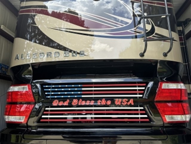 Exterior: Features air and hydraulic automatic leveling, separate window awnings, large automatic patio awning with wind sensor, smart exterior TV with soundbar, stainless steel skirting, and electric slide-out tray for storage access. Unique patriotic emblem on rear cap.