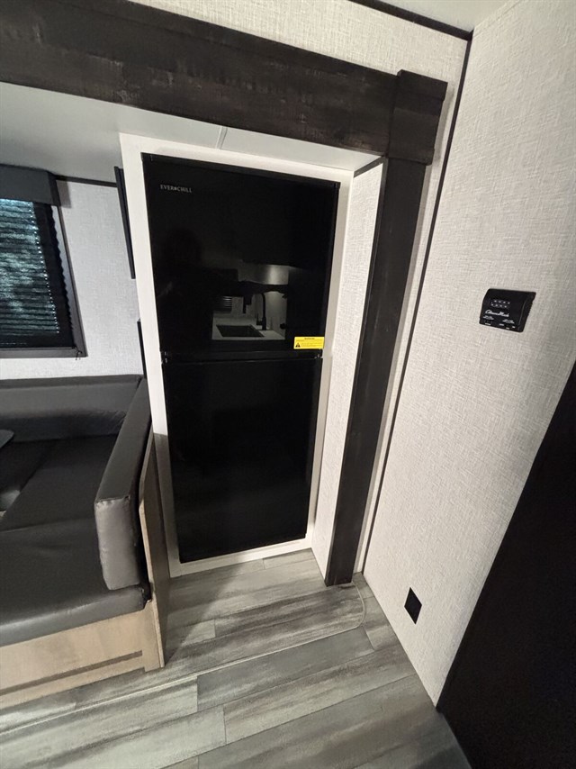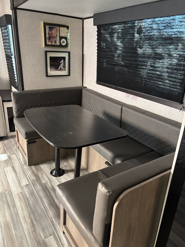 A collapsible u-shape dinette provides ample space for co-adventurers, while the front full-bed, nearby wardrobes, heavy duty struts for under bed storage, and barn sliding doors offers privacy for chaperones. A dome style digital TV antenna, and AM/FM/Bluetooth radio with indoor/outdoor zoned speakers can keep you and loved ones entertained, making your Go Play a perfect home away from home!