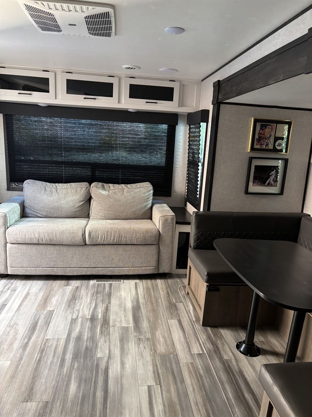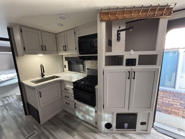 Kitchen includes a three-burner cooktop with a high output front burner, a double rack oven and microwave provide a sleek and easy-to-clean space for food prep while the range hood effectively removes smoke and odors from the kitchen. A residential high-rise faucet, single basin under-mount sink, 11cu/ft dual swing door 12V refrigerator, and residential vinyl flooring, with the flush floor slide, ensures practicality, making clean-up a breeze.