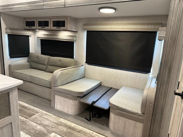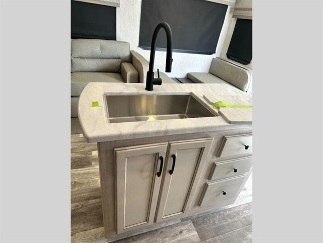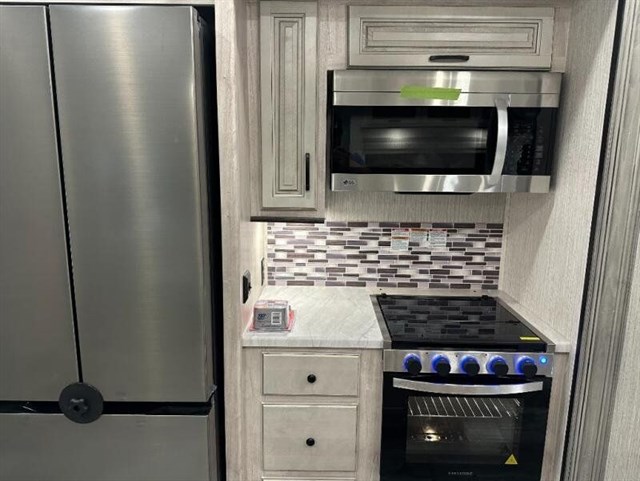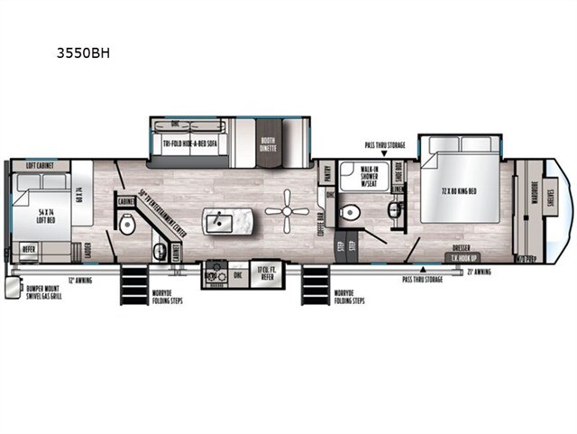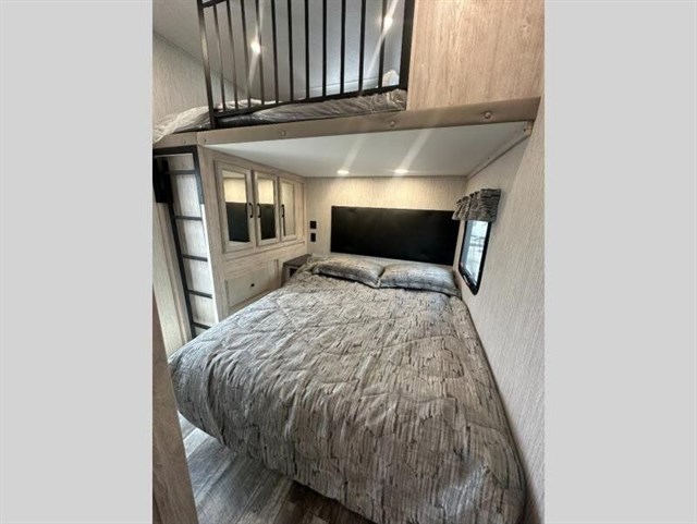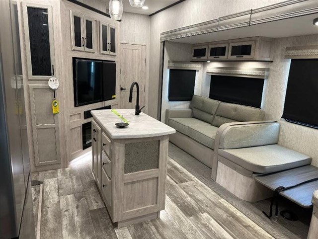 This fifth wheel is perfect for those whole like to camp with a whole group, whether it be with family or friends! There is a rear private suite with a lower bed and loft bed, a half bath, and your own private entrance. The front private bedroom includes a king bed slide out with a large front wardrobe and quick access into the spacious full bath. Everyone can meet in the main living area that includes dual opposing slides, a tri-fold sofa and a booth dinette, plus a 50" TV for movie night. There is also a coffee bar here where you can set up your Keurig machine, a pantry for snacks, and a ceiling fan to keep the air moving. You will also love the exterior swivel gas grill and exterior refrigerator for breakfast outdoors, and the two power awnings with LED lights will provide shade during the day and ambience at night!