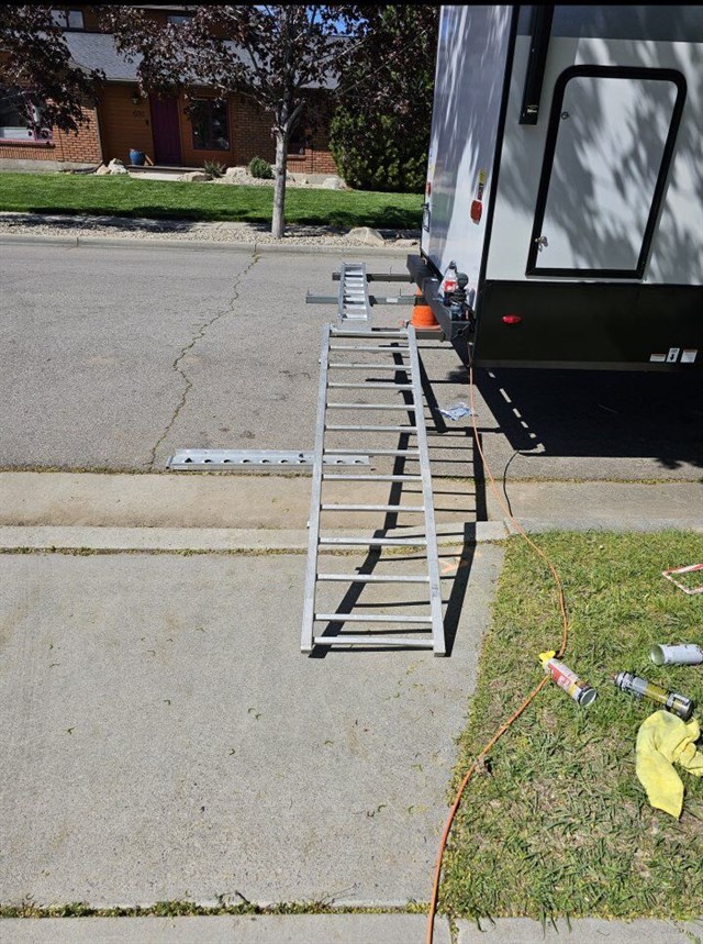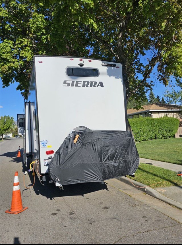 Always kept in covered storage when not in use. This has been an excellent trailer. Its not too heavy at just 14,200 pounds dry. It also has a stout 2" triple receiver on the back for an included moto carrier or whatever else you want to put behind it.