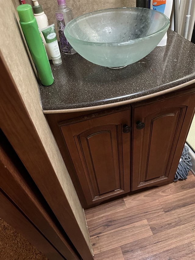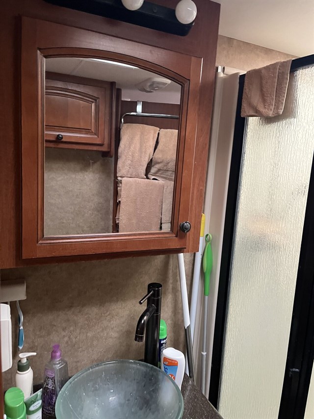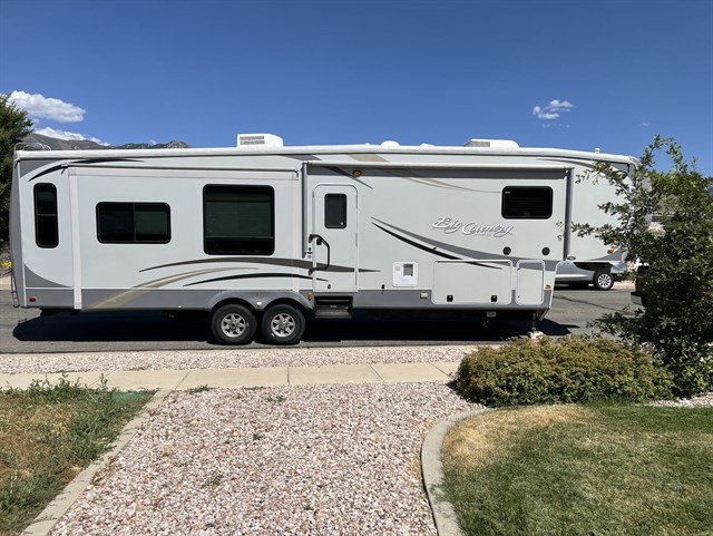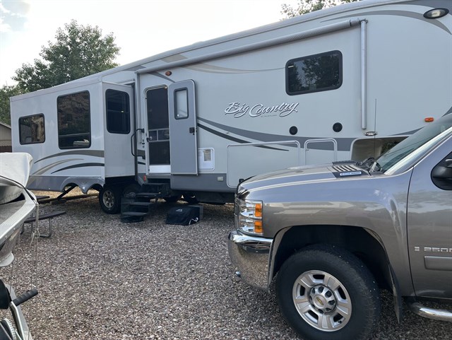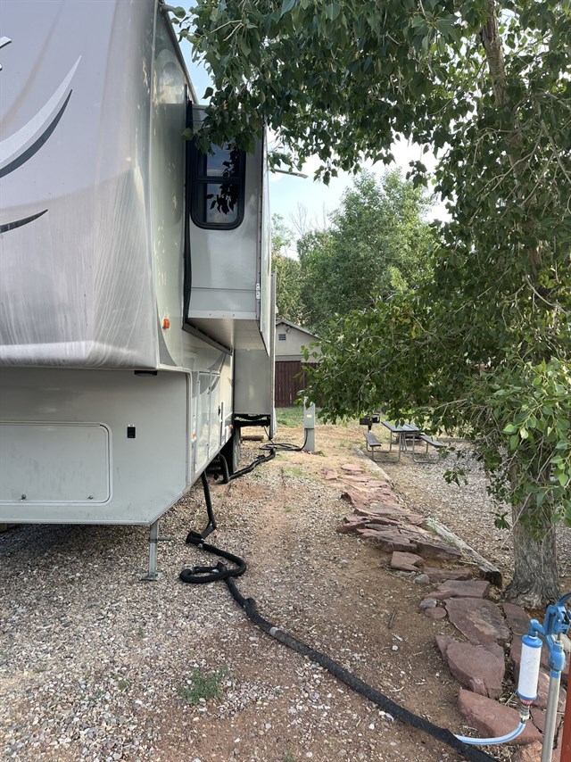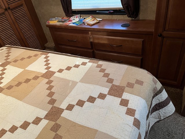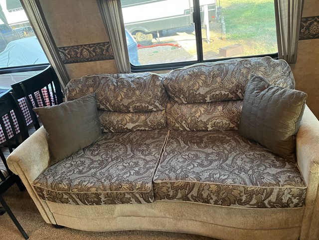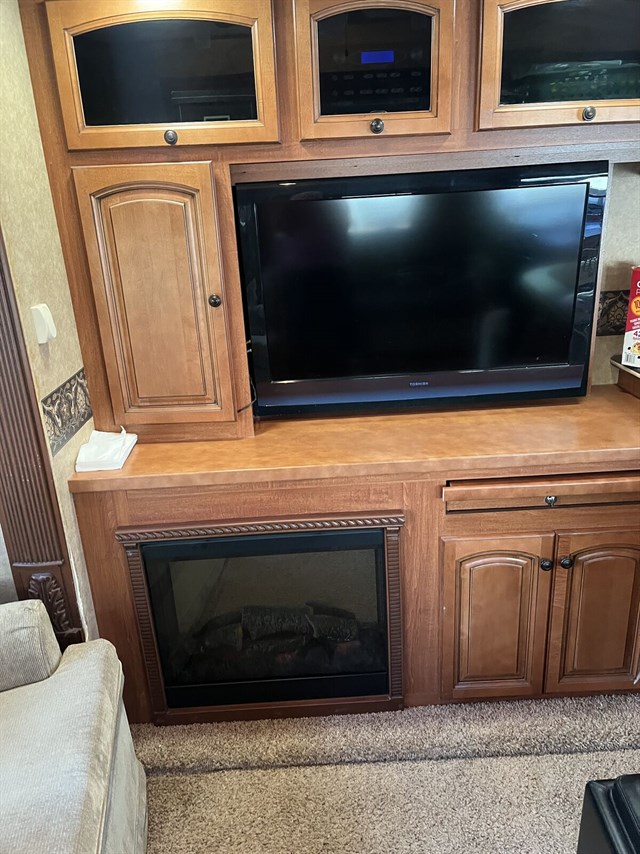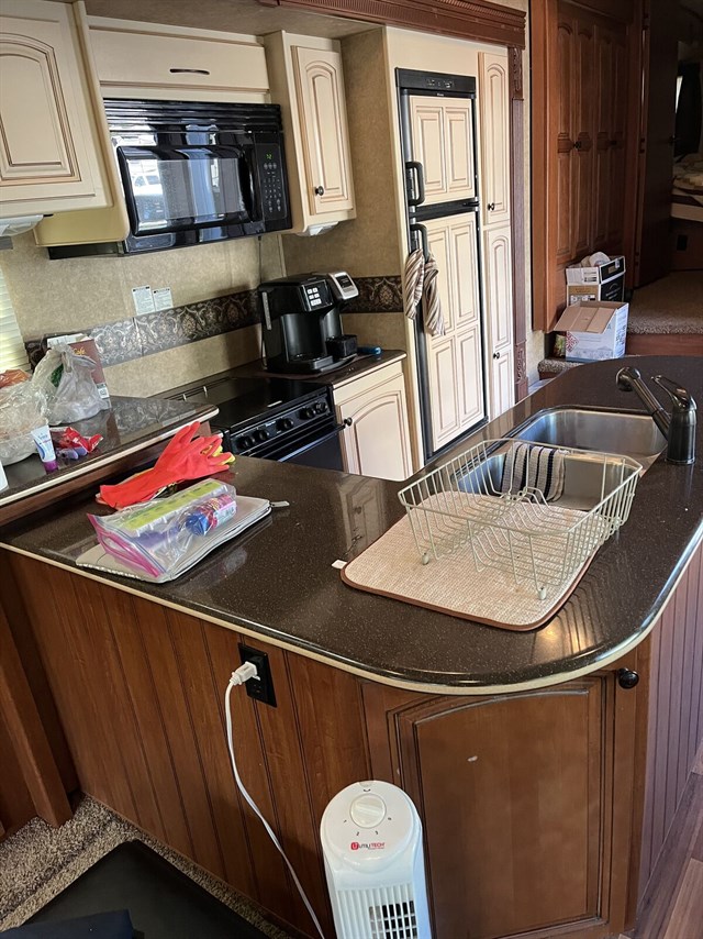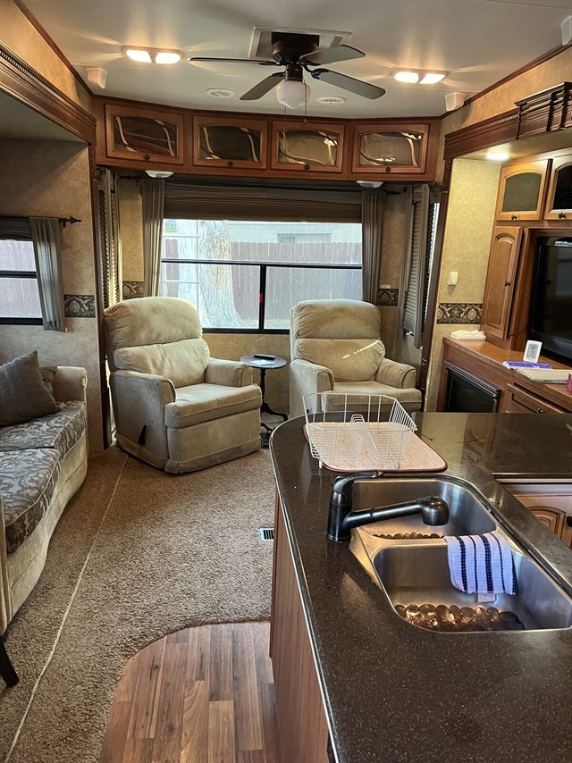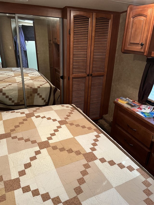 King size bed, couch makes into air bed, 2 recliners, fireplace, TV, stereo system, microwave, 4 burner stove and oven, antenna, two air conditioners,awning, plumbed for washer/dryer, small freezer in laundry area and hitch. Large closet and several drawers in bedroom. Shower, toilet and wash basin, coat closet and large area for linens or use as a pantry. Lots of storage areas. New tires, tripod for stabilizing the front, stabilizers for slides. Some utensils, dishes, cookware will stay.