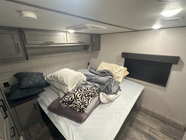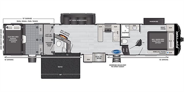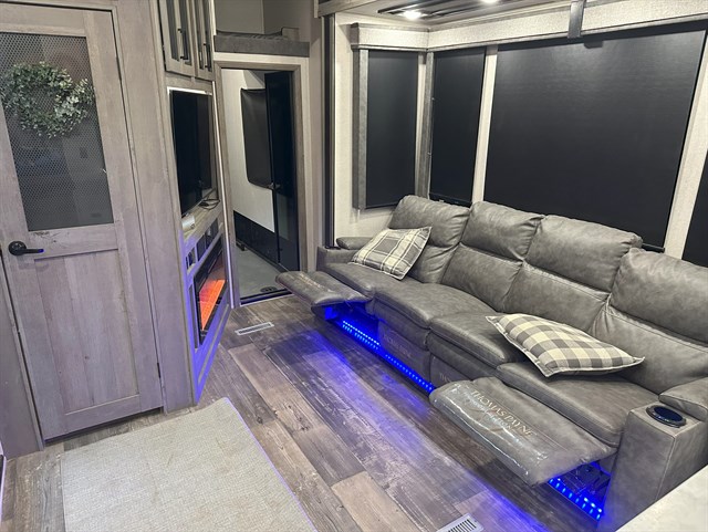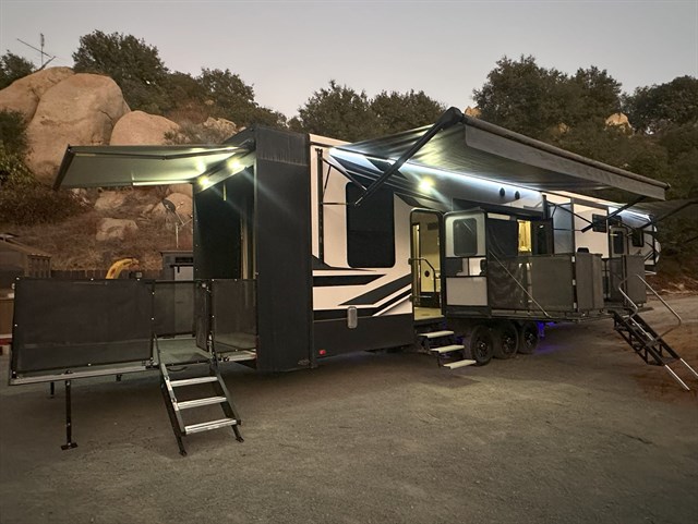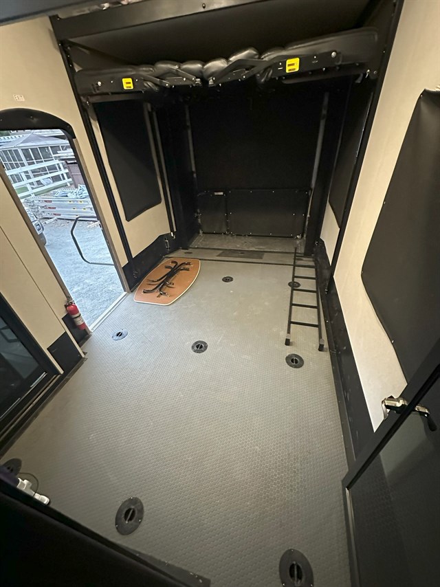 This 2021 47′ Raptor 5th wheel toy hauler with 3 slides is pure luxury wherever you might be travelling with a one of a kind custom built 2 and a half foot EXTENSION built into the back cargo for your toys!