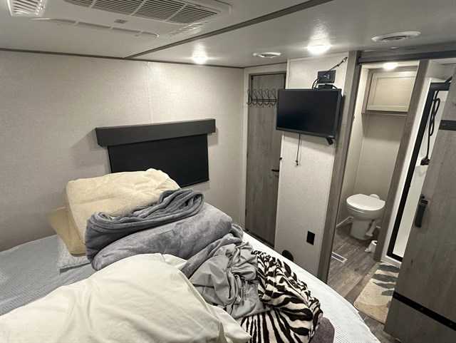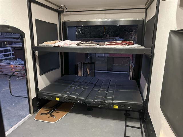 Garage has 2 electric drop down beds that turn into a seating area as well as a half bath with washer/dryer hookups and a TV