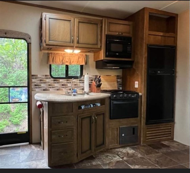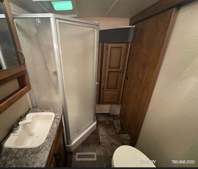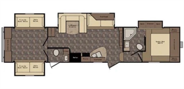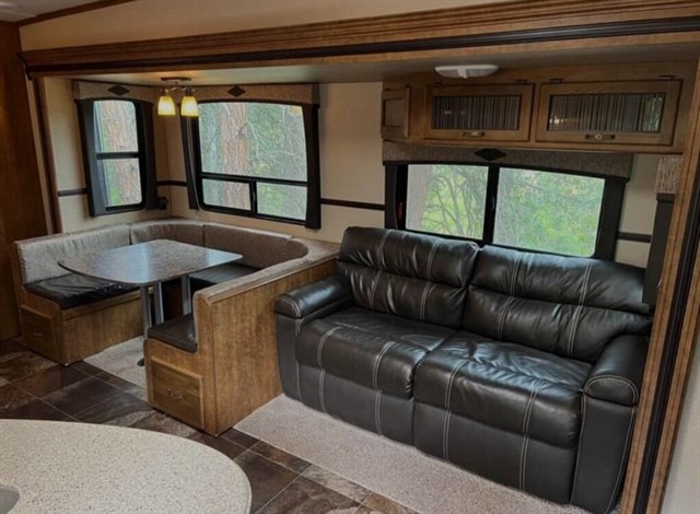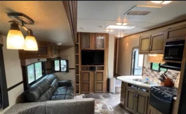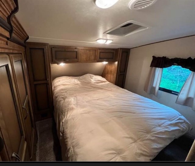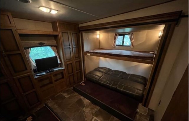 Super amazing 5th wheel camper. It can sleep up to 13 people which is a lot! It has a full bath in the master bedroom which has a nice shower. In the back is a bunk room with two bunk beds and under both bunk beds is a sofa that one turns into a sofa bed and the other side it turns into a bed and has a pull out bed. Love this camper but it’s just too big for our small family!