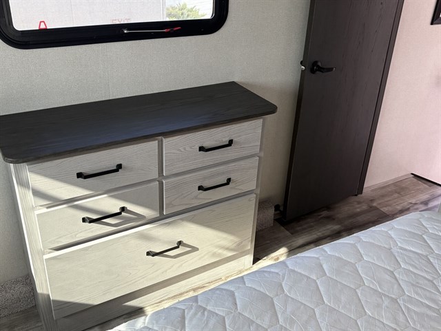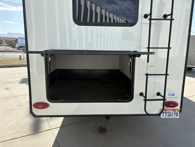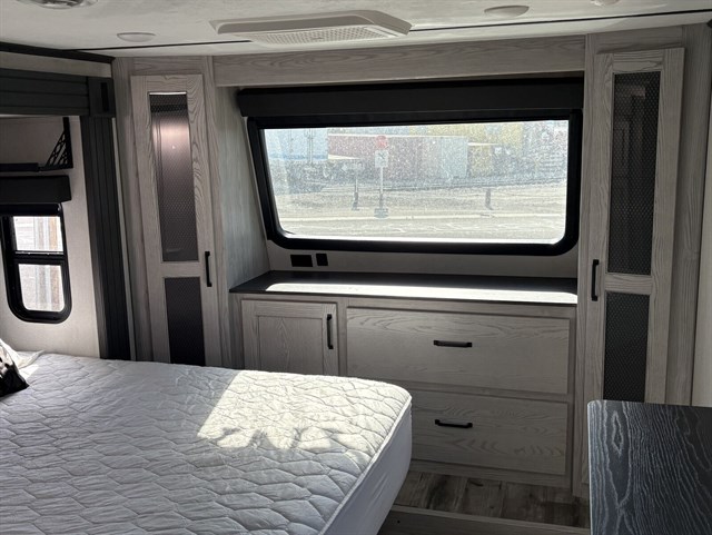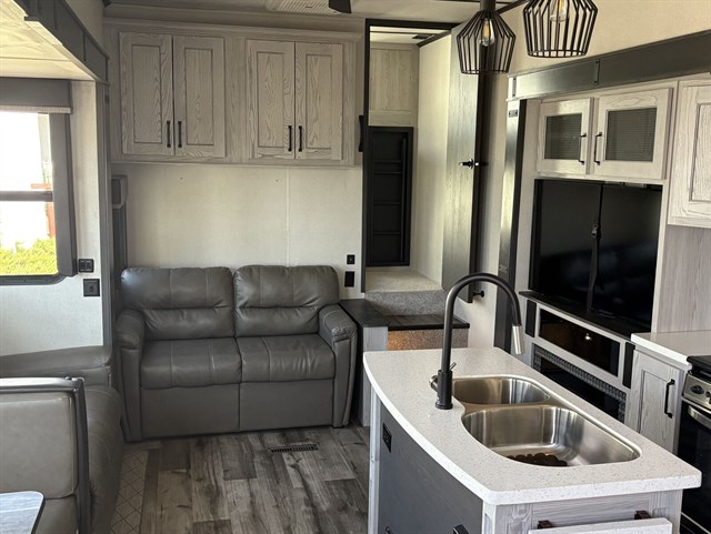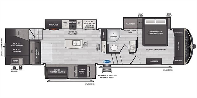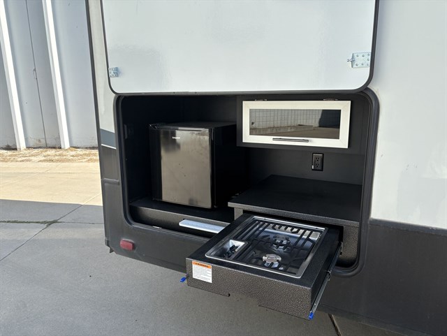 Exterior: Fiberglass siding, front cap with wrap-around design, dual power awnings, and an outdoor kitchen.