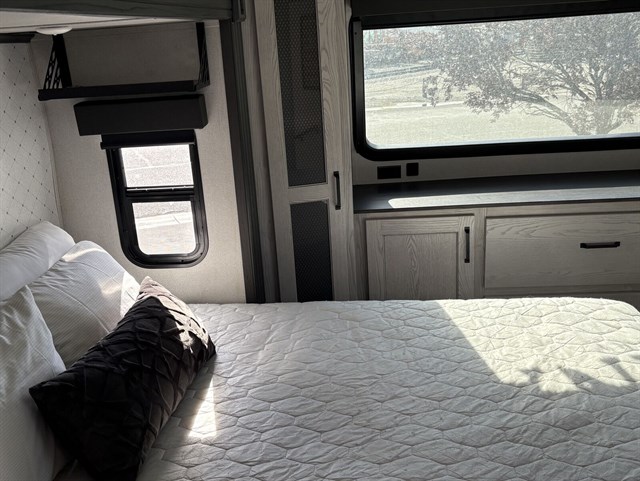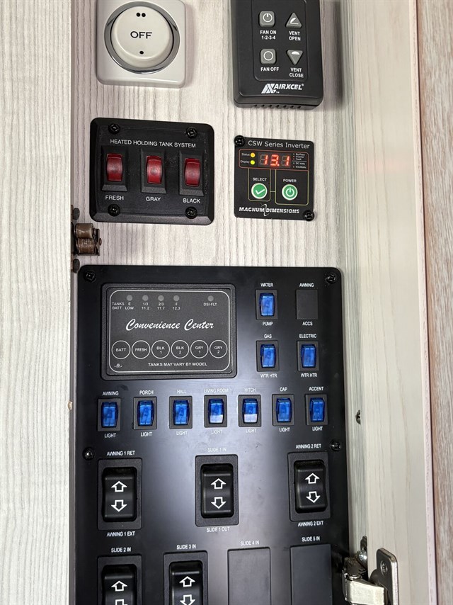 Interior: Central vacuum system, ceiling fan, Maxxair vents, LED lighting, and a fireplace.