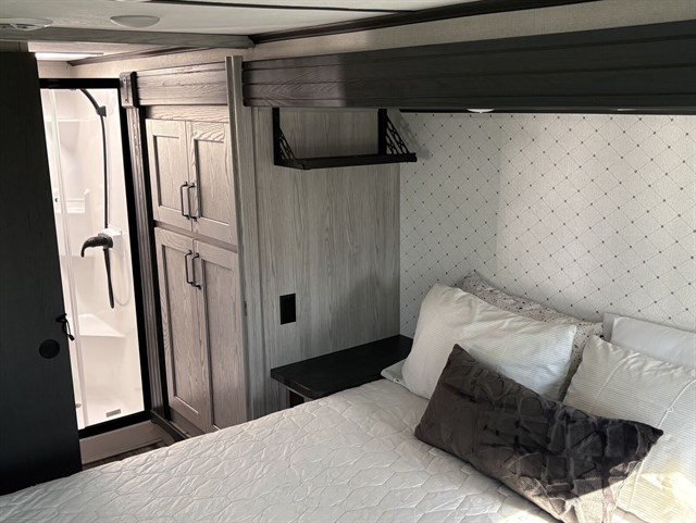 Bathroom: Neo-angled shower, skylight, Maxxair vent, and washer/dryer prep.