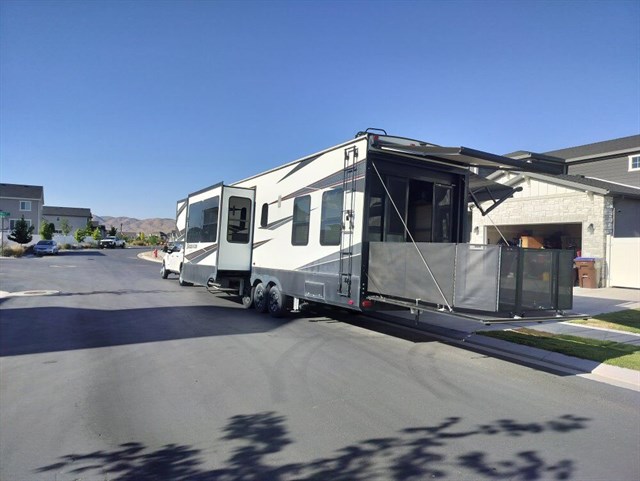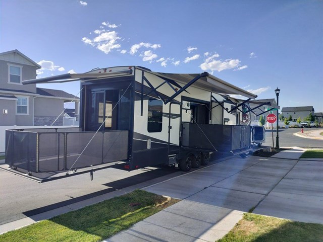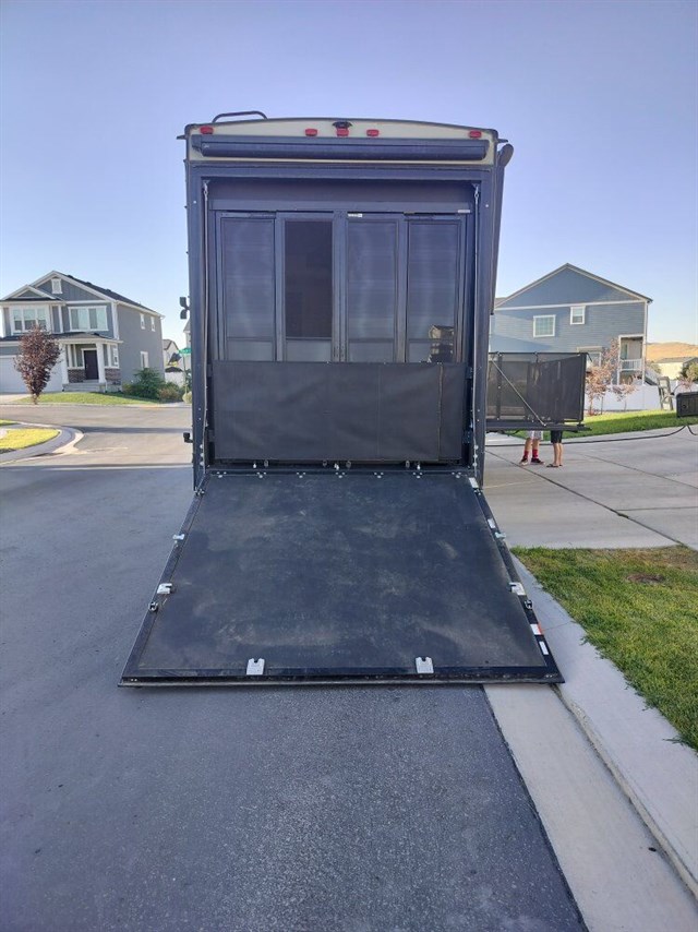 The 2020 Grand Design Momentum 399TH is a premium fifth-wheel toy hauler thoughtfully engineered for luxury, versatility, and adventure. Designed with a 13-foot garage and a dovetailed ramp for seamless loading—free of wheel wells—this model offers exceptional utility without compromising comfort. A standout feature is the fold-down side patio, complemented by a rear ramp patio and dual awnings with integrated LED lighting for enhanced outdoor living.