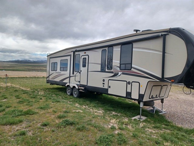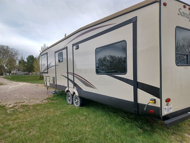 Plenty of space and room can be found in this Sandpiper 371REBH fifth wheel by Forest River. This model offers quad slides, a second room which can be used as a bunk house or second living area, and a rear entertainment center.