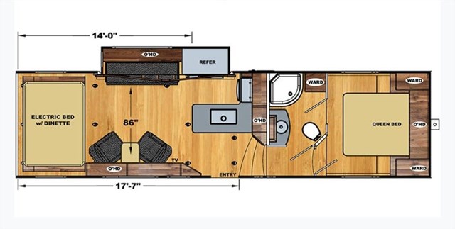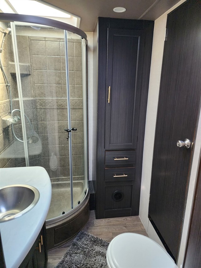 *150 gallons of freshwater, 50 gallons each of gray and black tank capacity,dual propane tanks.