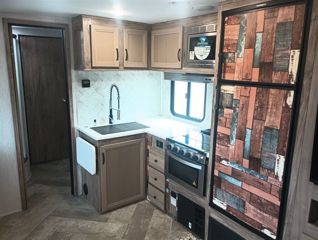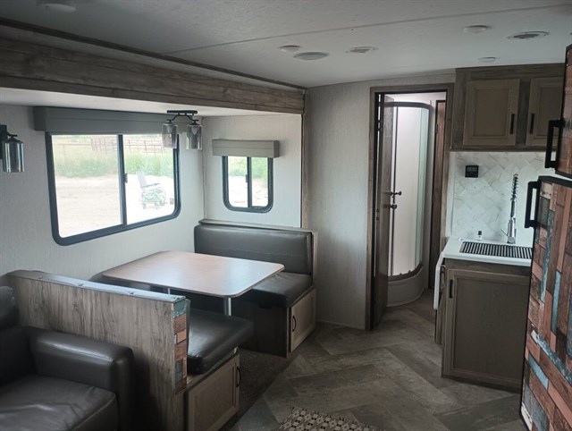 Outside, it features a large awning with lights, outdoor kitchen, outdoor shower, and an entertainment system, making it easy to enjoy the great outdoors. With it's durable construction and lightweight design, this travel trailer is easy to tow and maneuver on the road. We have hauled it to baseball tournaments the past two summers.